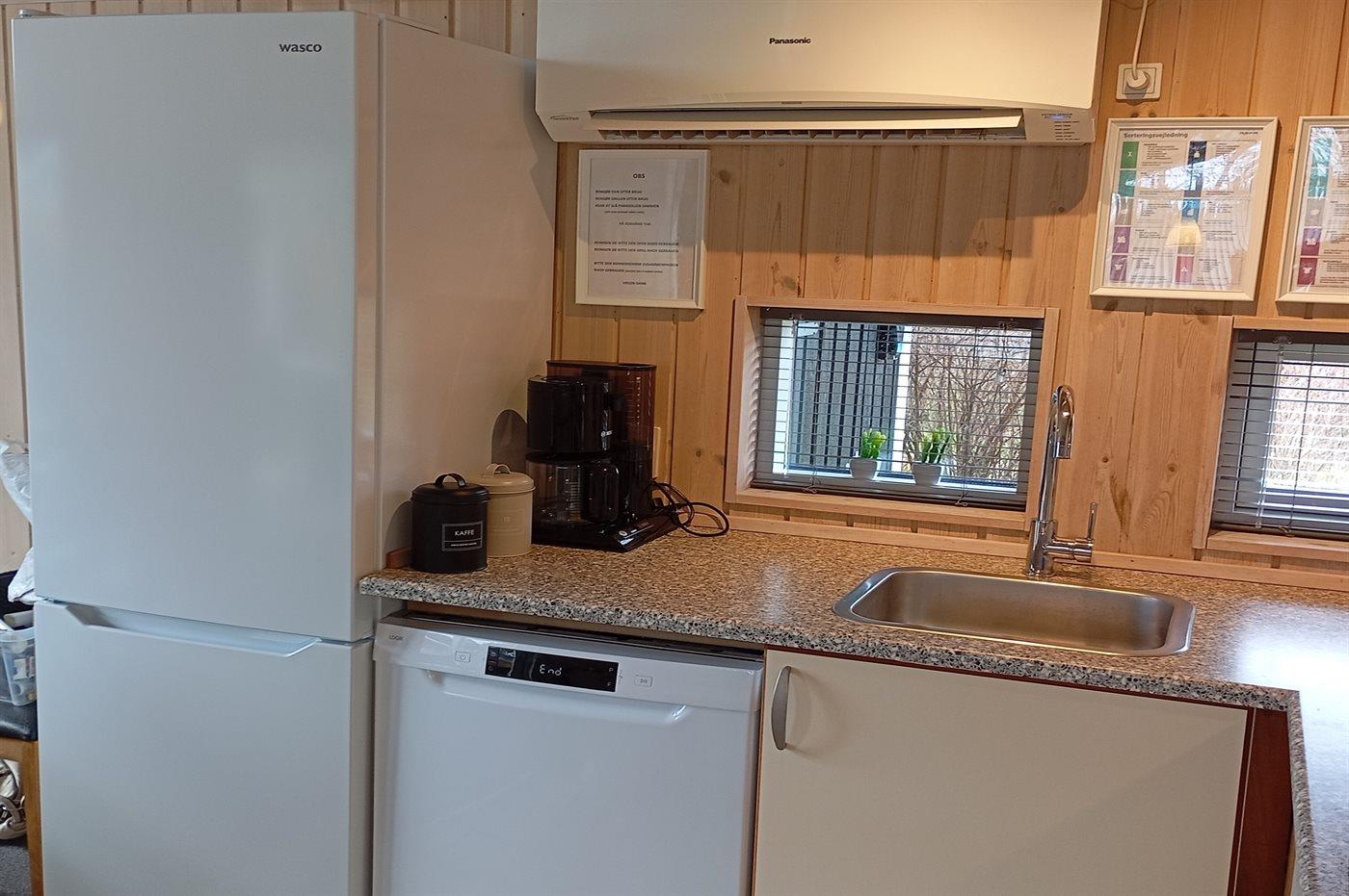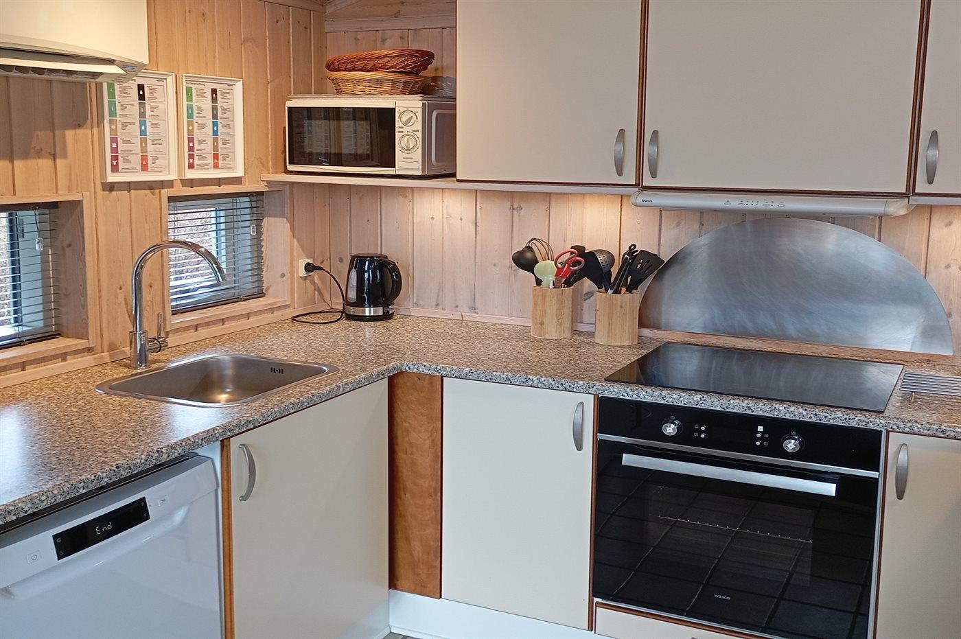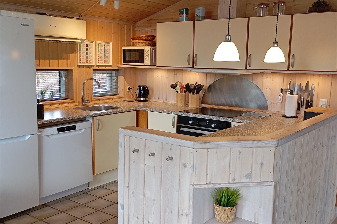 Køkkenet er udstyret med 1 køleskab. Der er 4 induktionskogeplader, varmluftovn, mikrobølgeovn samt opvaskemaskine.