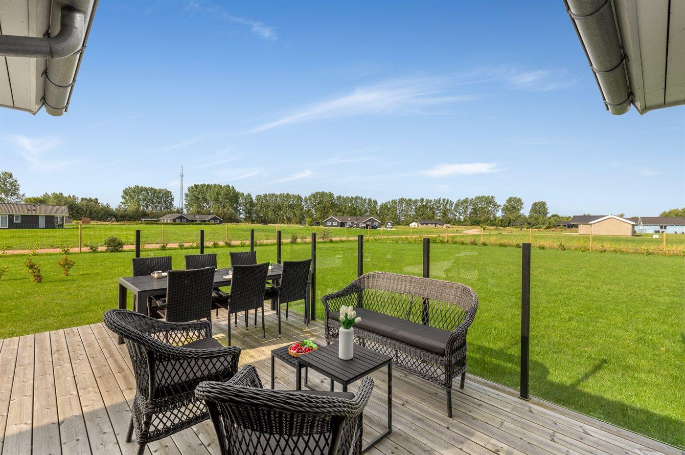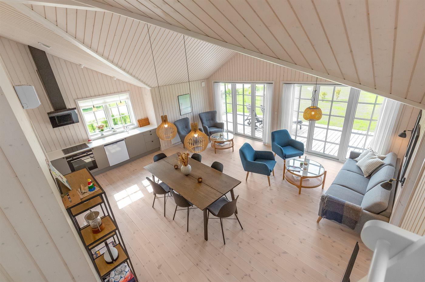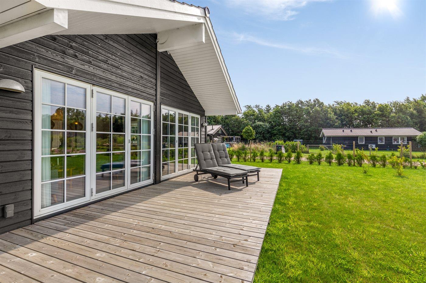 Huset er indrettet med et stort køkken alrum og er i åben forbindelse med stuen, hvorfra der er udgang til den hyggelige træterrasse. På terrassen er der liggevogne, havemøbler og grill til rådighed.