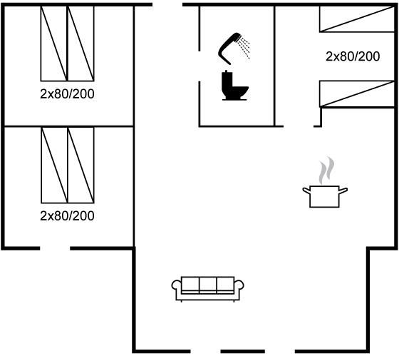 Sommerhuset har 3 gode værelser med enkeltsenge, som også kan stilles sammen til dobbeltseng, hvis man ønsker dette. Desuden er der 1 soveplads på husets hems, så der er mulighed for at vælge, hvor man vil sove. Flot badeværelse med gulvvarme.