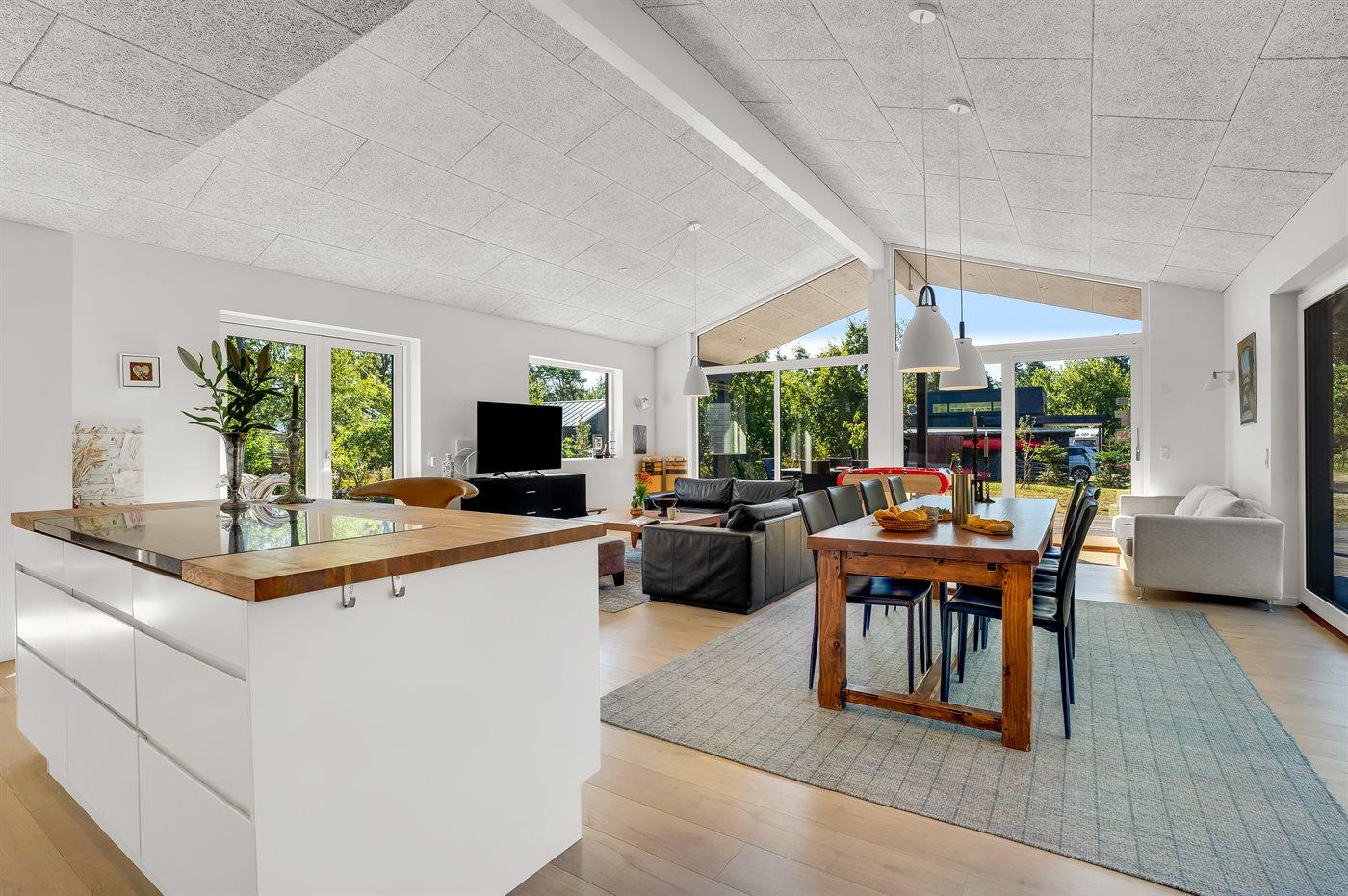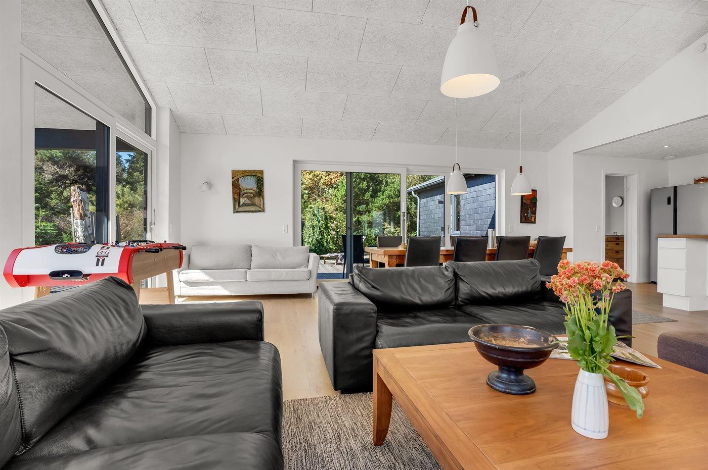 Huset er indrettet i lyse farver og optimalt til to familier, der ønsker at bo sammen, eller til den lille familie, der ønsker masser af plads og en beliggenhed tæt på vandet. Her kan du nemt gå en tur, tage en morgensvømmer, og børnefamilier kan hurtigt nå hjem til huset fra stranden.