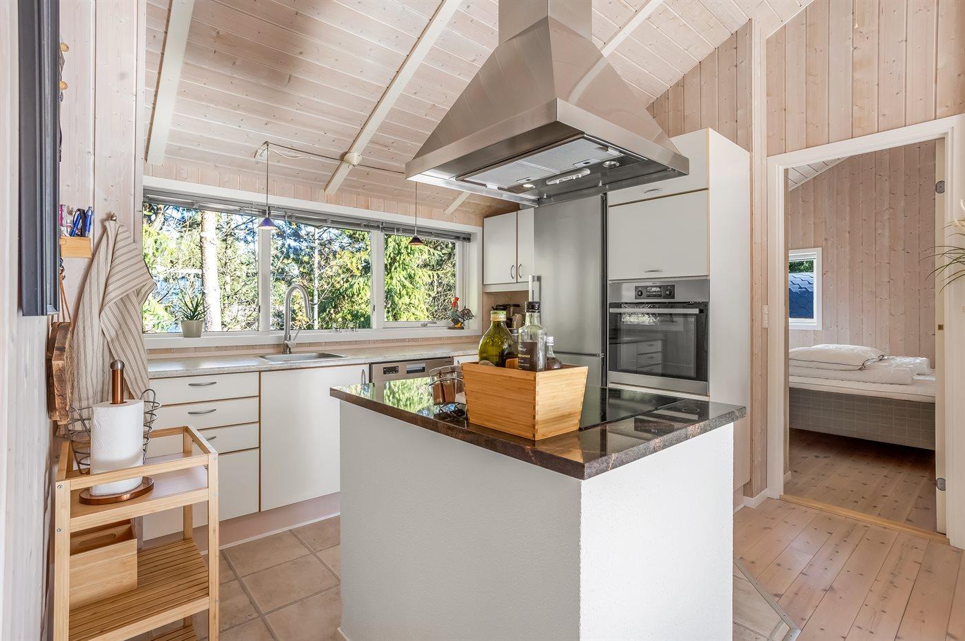 Køkkenet er udstyret med 1 køleskab. Der er 4 keramiske kogeplader, varmluftovn, mikrobølgeovn samt opvaskemaskine.