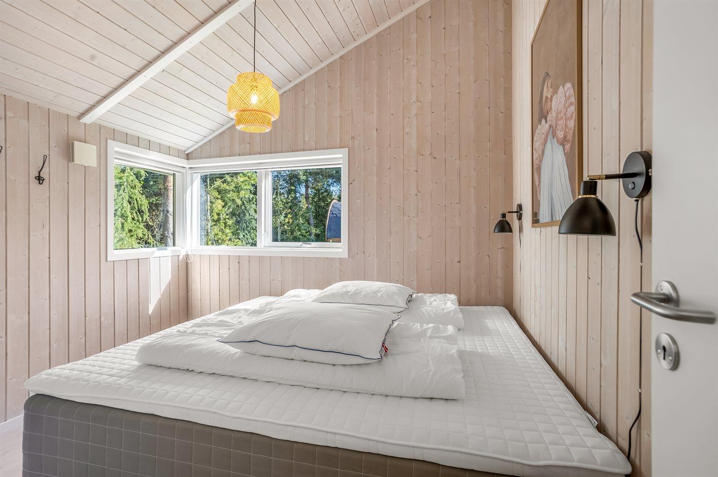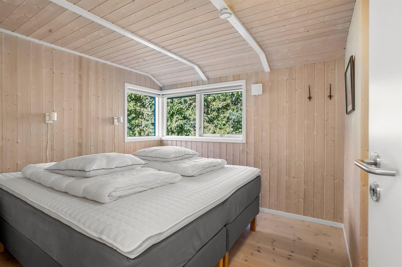 Der er i alt 3 soveværelser. Sovepladserne fordeler sig på: 6 sovepladser i dobbeltsenge. 2 sovepladser på madrasser. 2 af disse sovepladser befinder sig i et anneks og 2 af dem befinder sig på hemsen. Derudover er der 1 stk. barneseng.