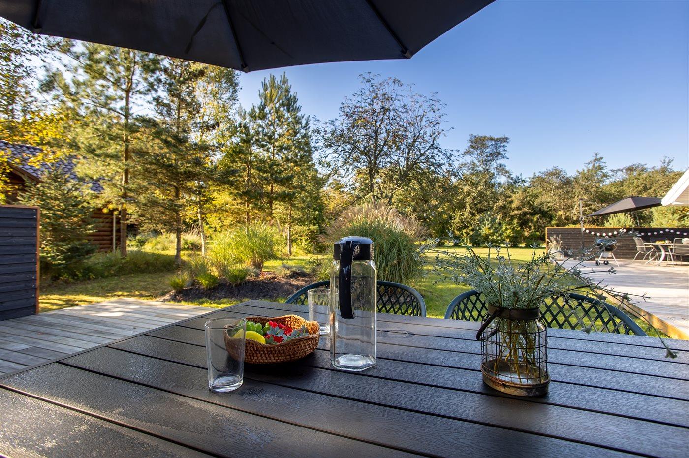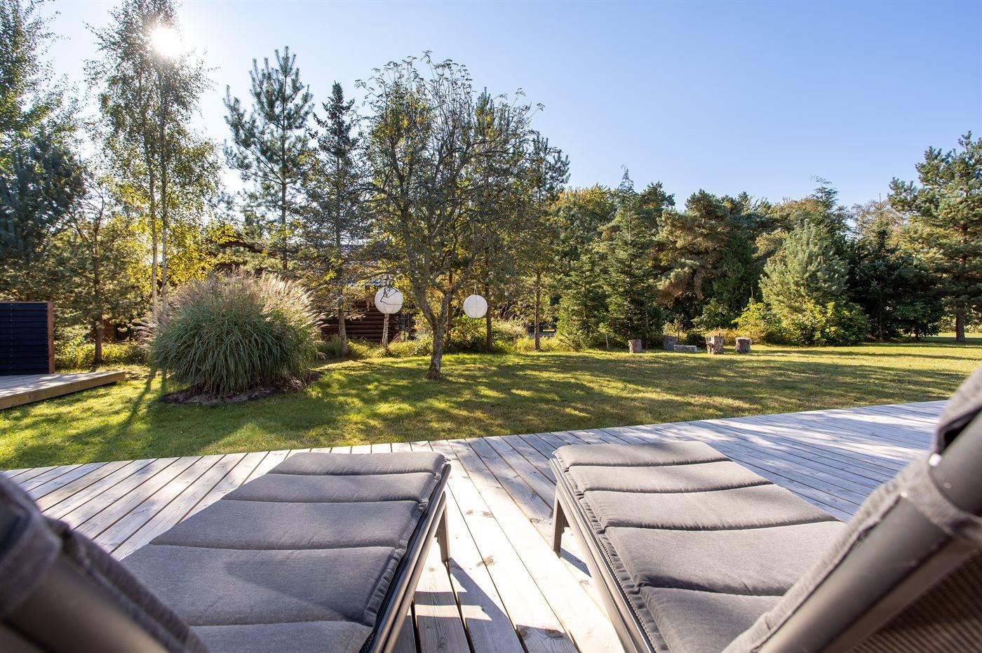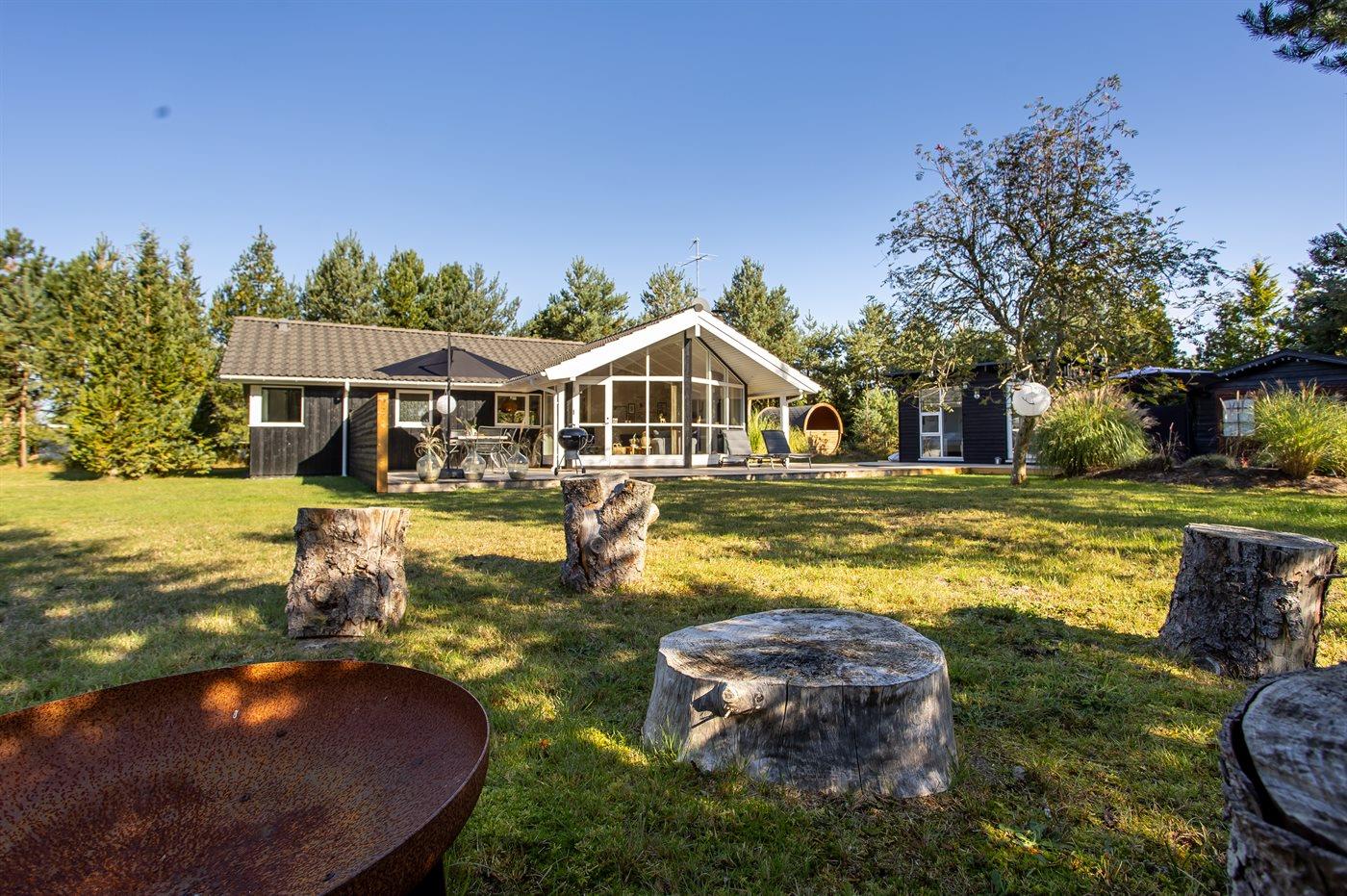 Ferieboligen er beliggende på en 1273 m² stor naturgrund. Der er 900 m til havet. Til ferieboligen hører åbent terrasseareal. Bålsted. Udendørs sauna. Grill til rådighed. Der er installeret stik til opladning af elbil. Type 2 stik. Parkering ved ferieboligen.