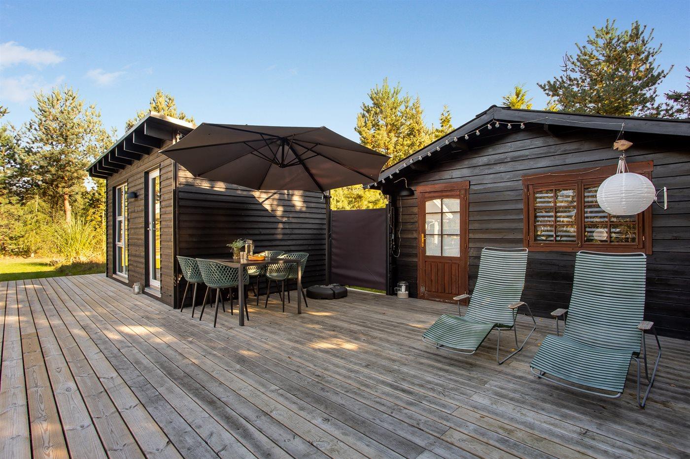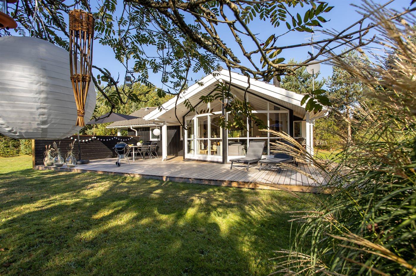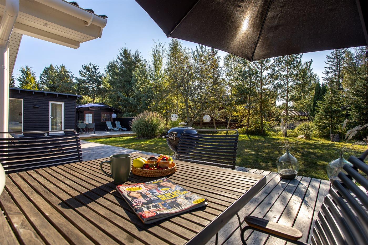 Ferieboligen er beliggende på en 1273 m² stor naturgrund. Der er 900 m til havet. Til ferieboligen hører åbent terrasseareal. Bålsted. Udendørs sauna. Grill til rådighed. Der er installeret stik til opladning af elbil. Type 2 stik. Parkering ved ferieboligen.