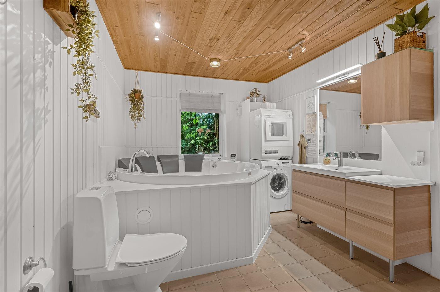 Der er 2 badeværelser med bruseniche og 3 toiletter, heraf 1 gæstetoilet. Der er gulvvarme på 2 badeværelser. Der er gulvvarme på gæstetoilettet. I saunaen er der mulighed for afslapning.