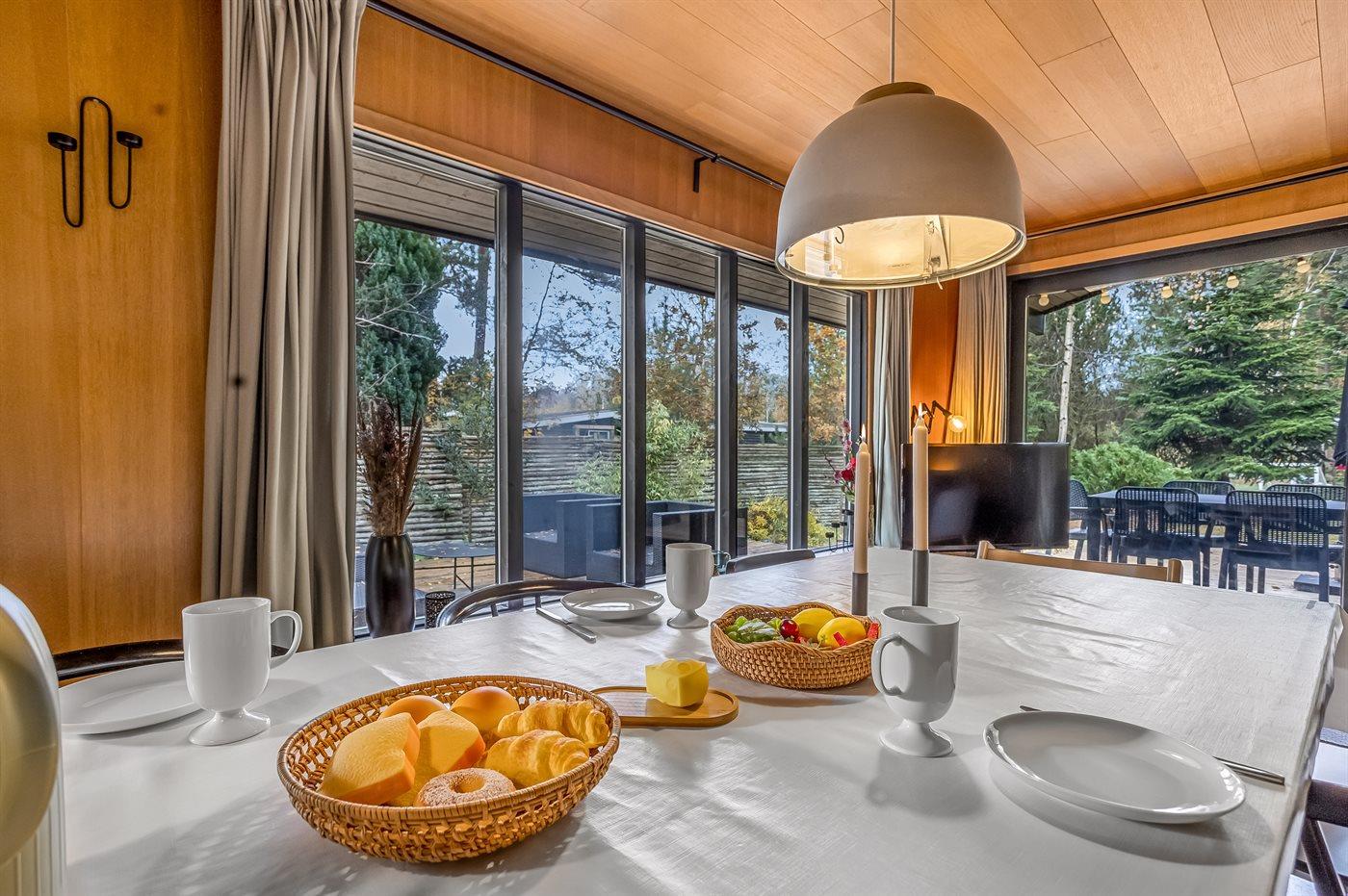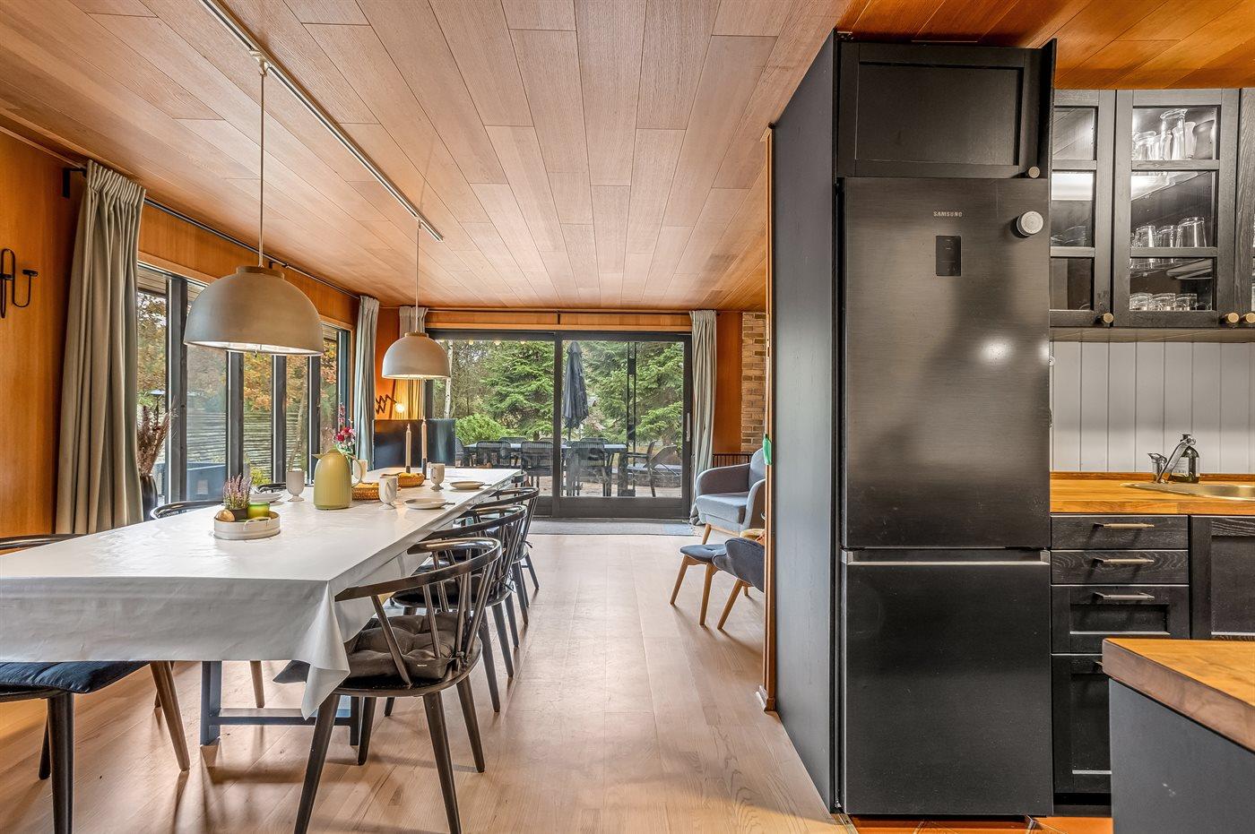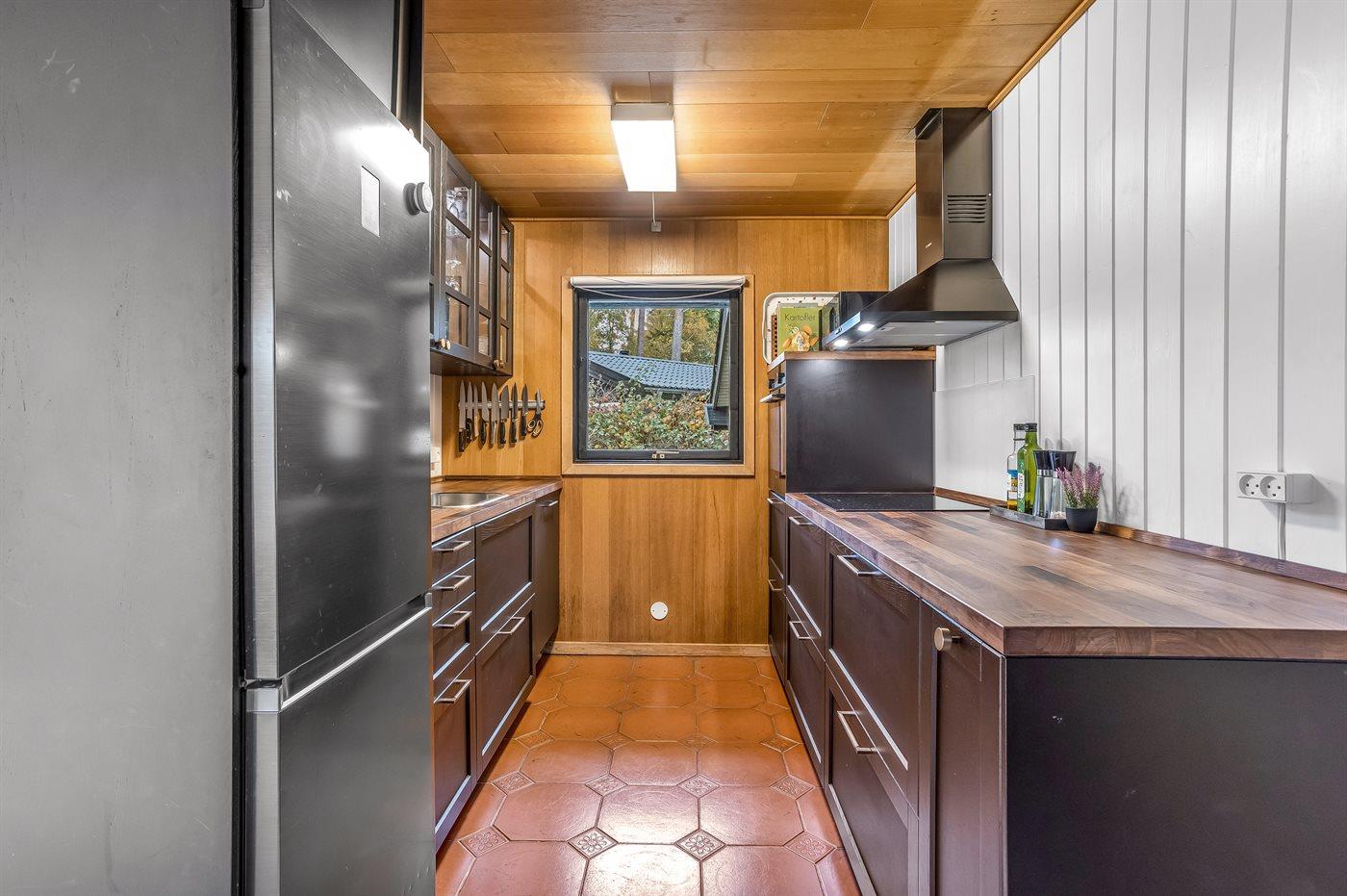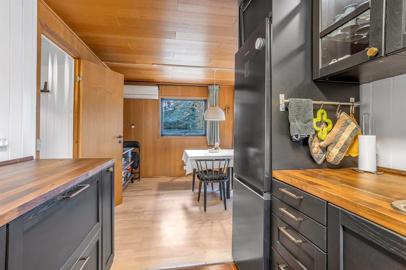 Køkkenet er udstyret med 1 køleskab. Der er 4 induktionskogeplader, varmluftovn, mikrobølgeovn samt opvaskemaskine.