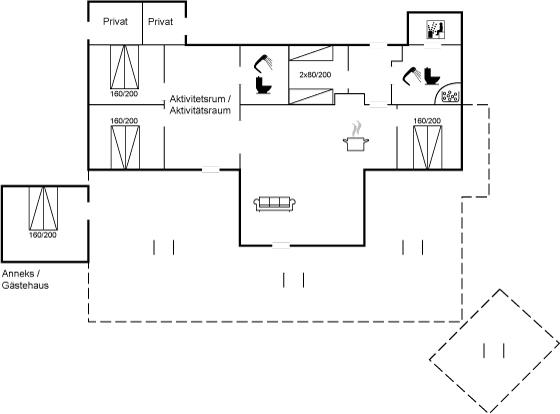 Der er i alt 5 soveværelser. Sovepladserne fordeler sig på: 8 sovepladser i dobbeltsenge. 2 sovepladser i enkeltsenge. 2 af disse sovepladser befinder sig i anneks.
