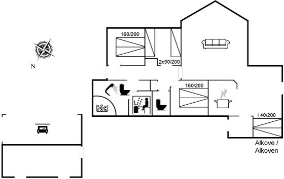 Der er i alt 3 soveværelser. Sovepladserne fordeler sig på: 6 sovepladser i dobbeltsenge. 2 sovepladser i enkeltsenge. 2 sovepladser på madrasser. 1 soveplads i alkove. 2 af disse sovepladser befinder sig på husets hems, og 2 befinder sig i stuen.