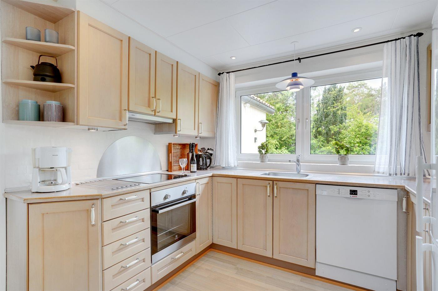 Køkkenet er udstyret med 1 køleskab. Der er 4 keramiske kogeplader, varmluftovn, mikrobølgeovn samt opvaskemaskine.