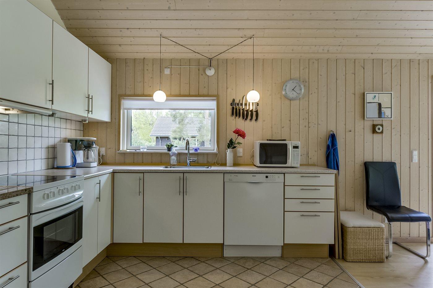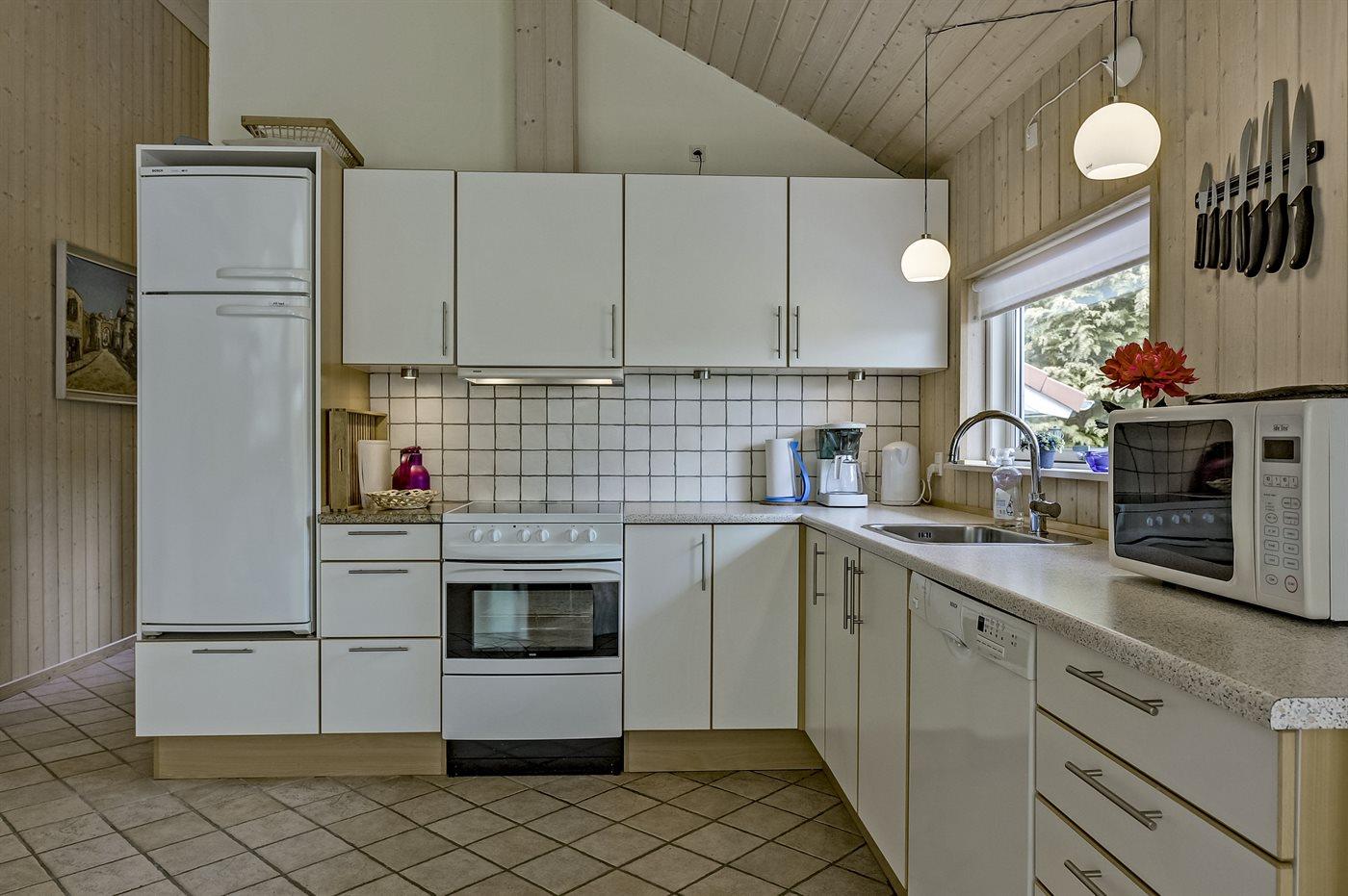 Køkkenet er udstyret med 1 køleskab. Der er 4 keramiske kogeplader, varmluftovn, mikrobølgeovn samt opvaskemaskine Der er gulvvarme i køkkenet.