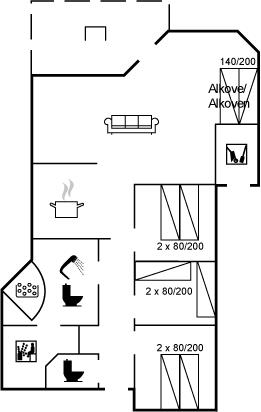 Der er i alt 3 soveværelser. Sovepladserne fordeler sig på: 4 sovepladser i dobbeltsenge. 2 sovepladser i enkeltsenge. 2 sovepladser i alkove. Derudover er der 1 stk. barneseng.