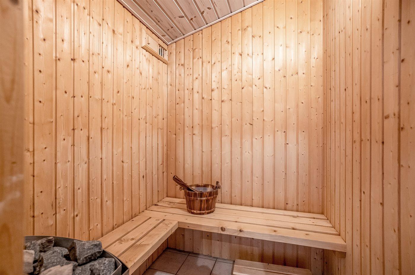 Der er 2 badeværelser med bruseniche og 2 toiletter. Der er gulvvarme på 2 badeværelser. I saunaen er der mulighed for afslapning.
