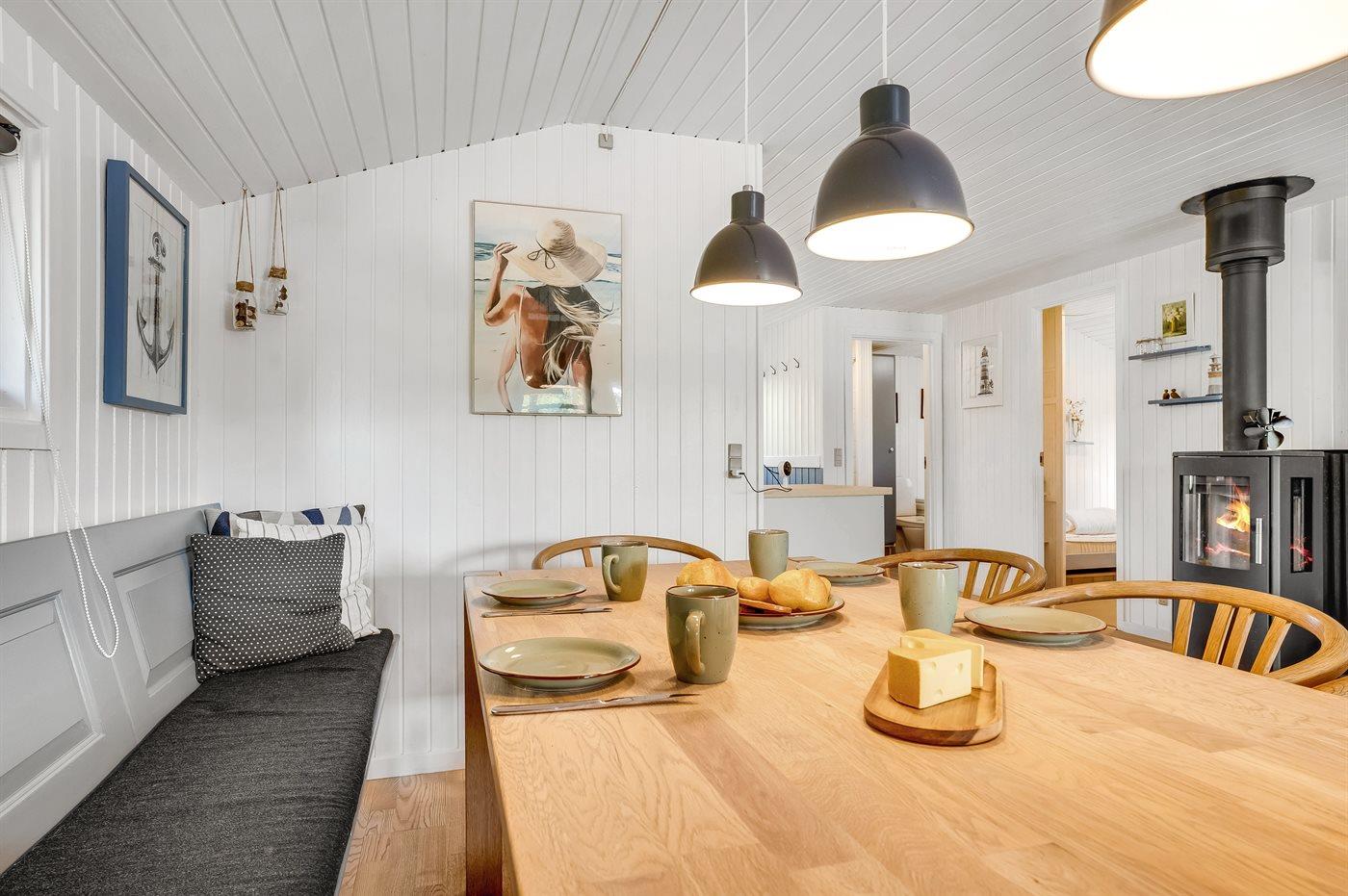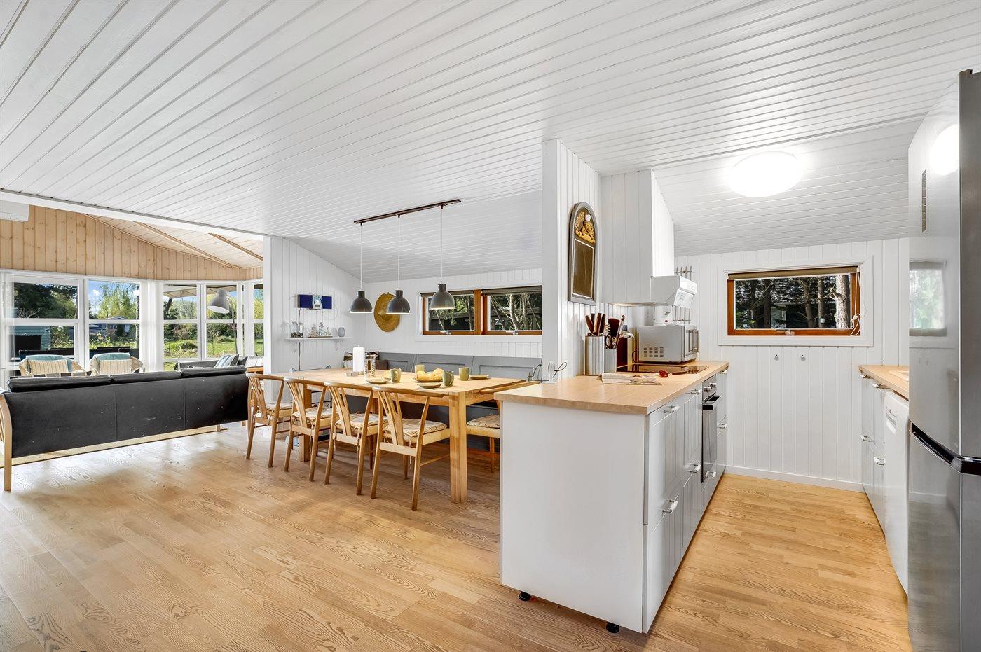 I det hyggelige køkkenområde finder I et dejligt stort spisebord med en stor bænk og stole således der er plads til alle. Der findes en 2 høje trip trap stole, den ene med bøjle til det mindste barn.