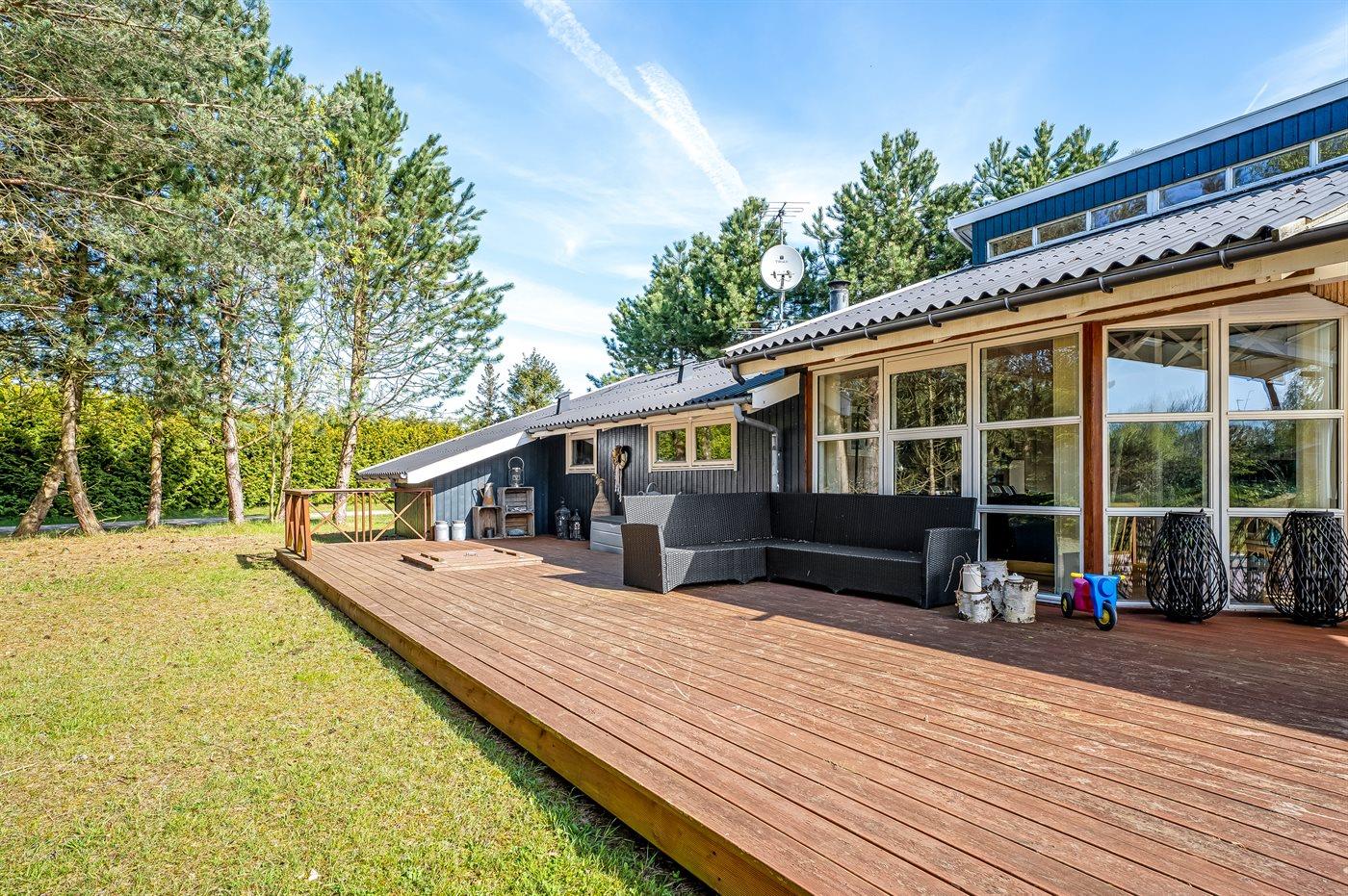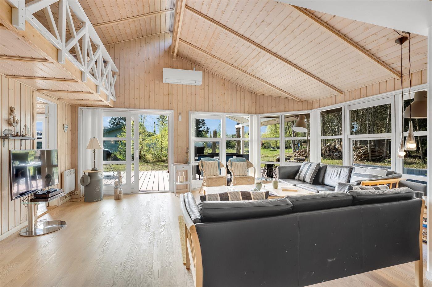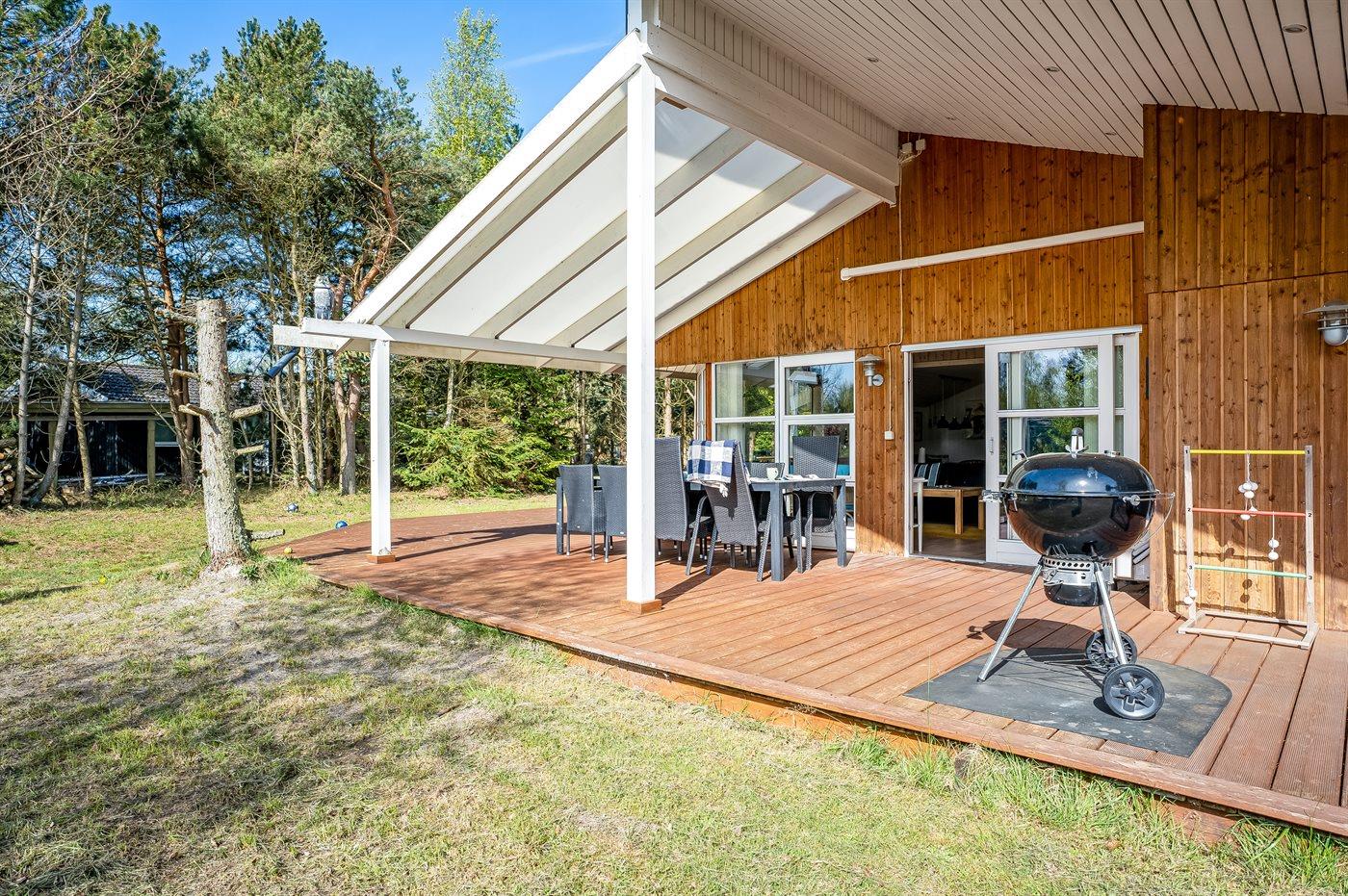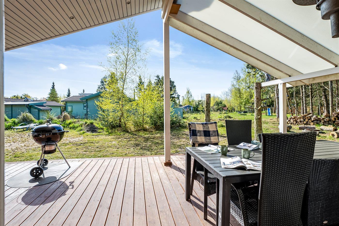 Fra husets stue går man ud på den lækre træterrasse, som er på 40 kvm åben og +24 kvm overdækket. Her sidder man i læ og kan nyde forår, sommer og efterår samt den dejlige ro. Man kan også være heldig og se dyrelivet. På terrassen er der tilhørende udendørsmøbler til 11 personer og et loungesæt. Der er 2 solsenge, samt en stor Weber-kulgrill - når sommeraftenerne skal nydes.