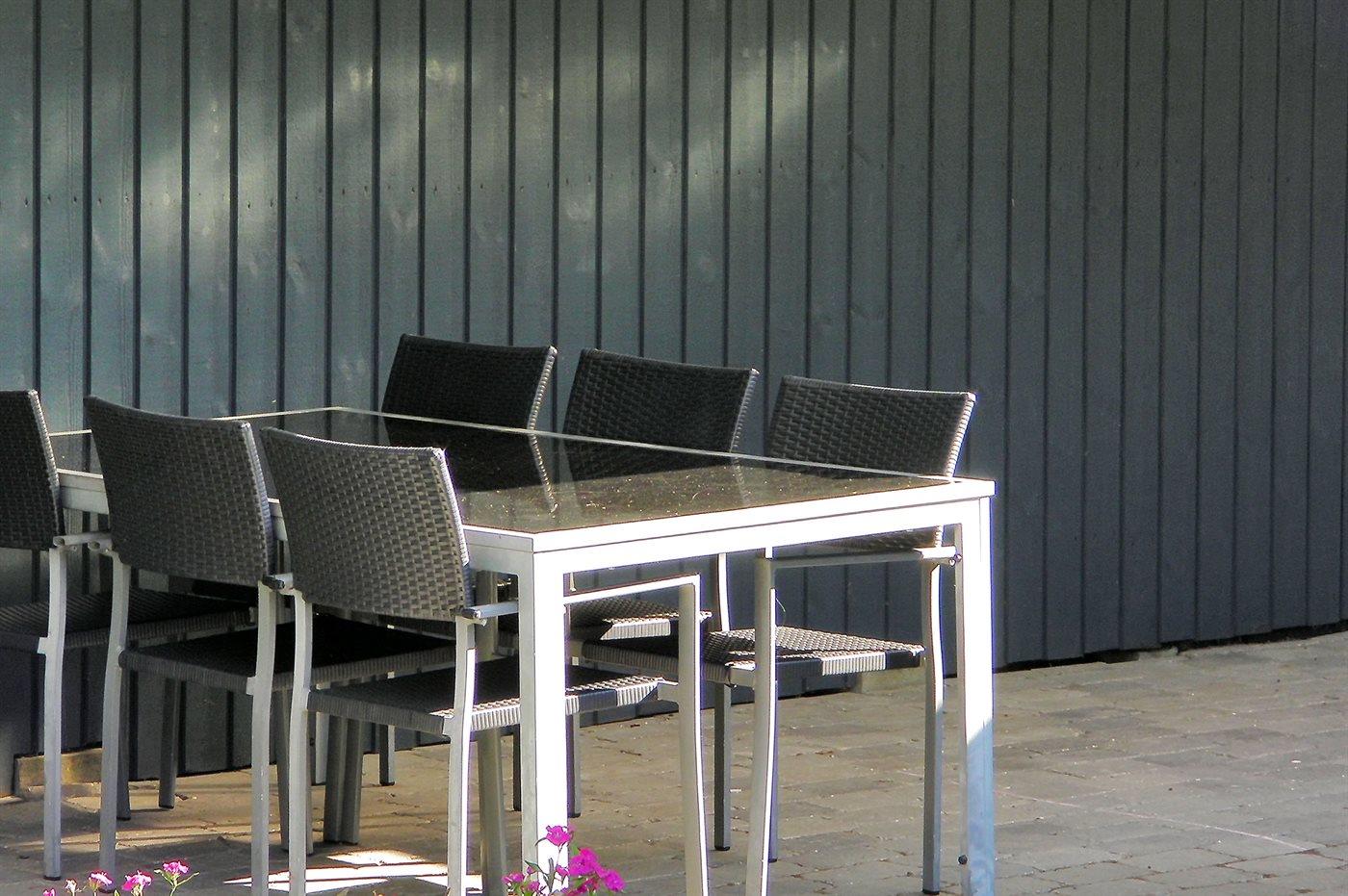 Ferieboligen er beliggende på en 512 m² stor havegrund. Grunden er indhegnet. Der er 200 m til havet. Nærmeste forretning er beliggende i en afstand af 75 m. Til ferieboligen hører 40 m² terrasseareal. Desuden er der 15 m² overdækket terrasse. Der er redskabsrum. Gynge. Sandkasse. Grill til rådighed. Parkering ved ferieboligen.