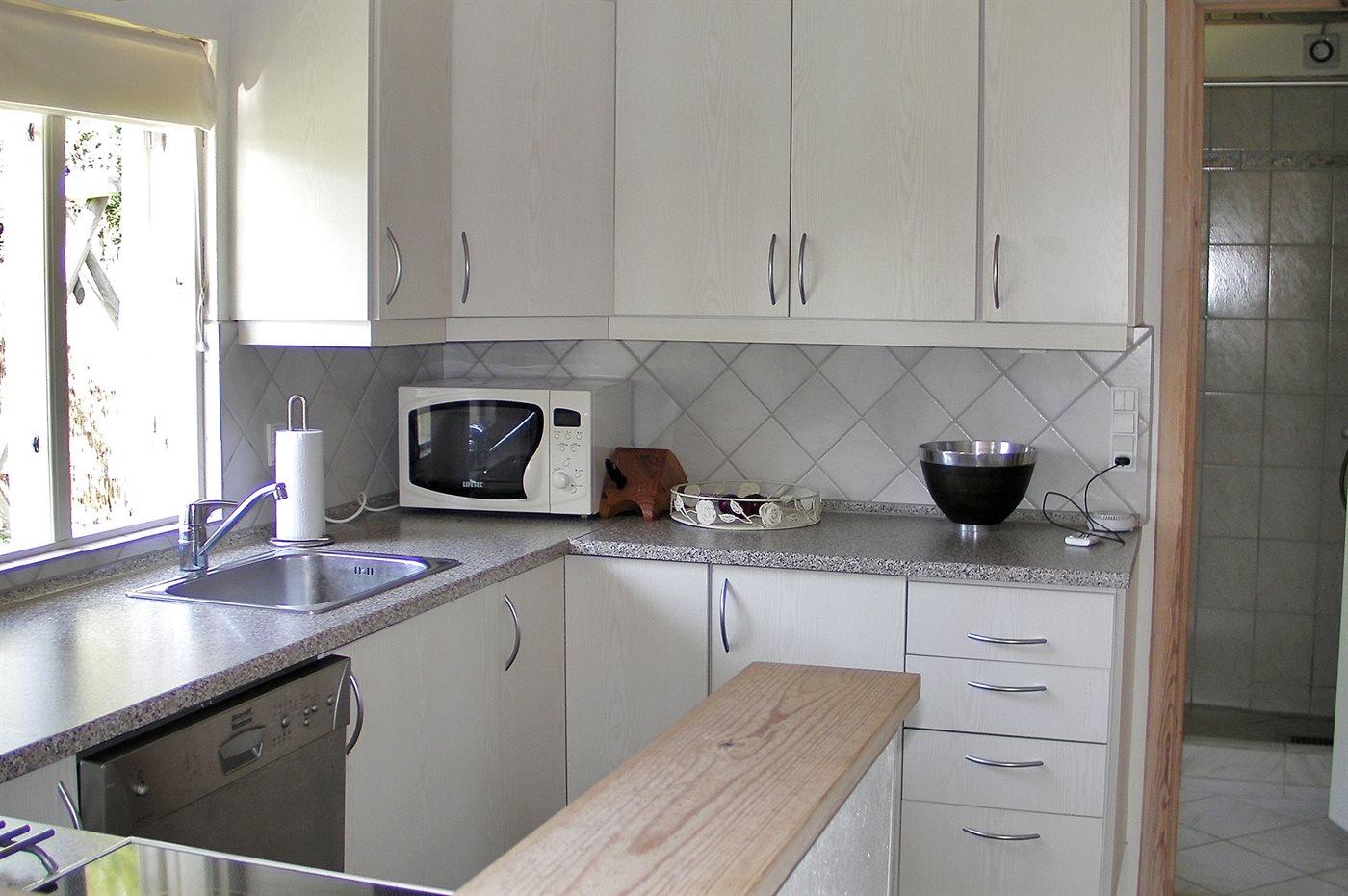 Køkkenet er udstyret med 1 køleskab. Der er 4 keramiske kogeplader, varmluftovn, mikrobølgeovn samt opvaskemaskine.