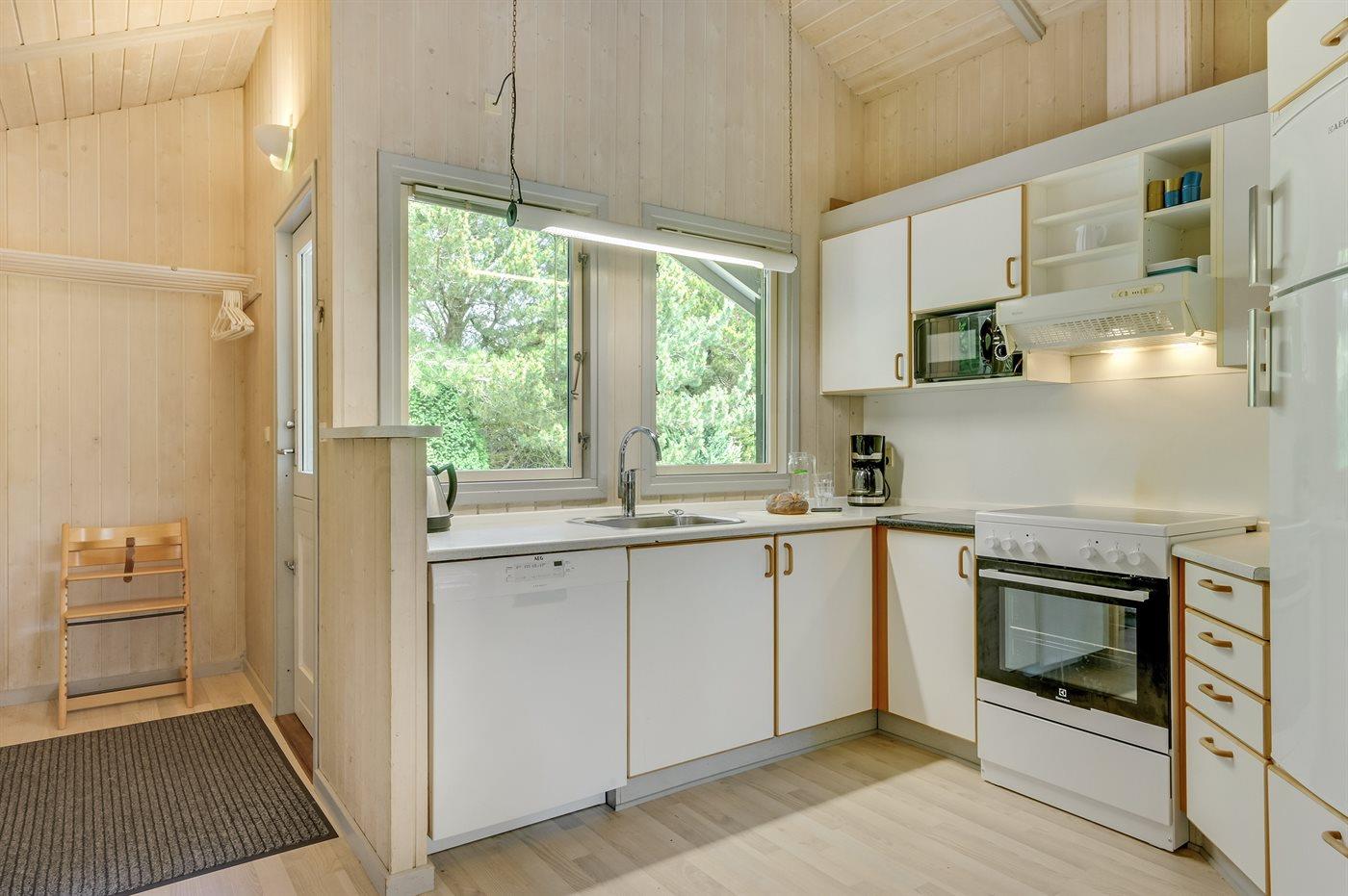 Køkkenet er udstyret med 1 køleskab. Der er 4 elkogeplader, bageovn, mikrobølgeovn samt opvaskemaskine.