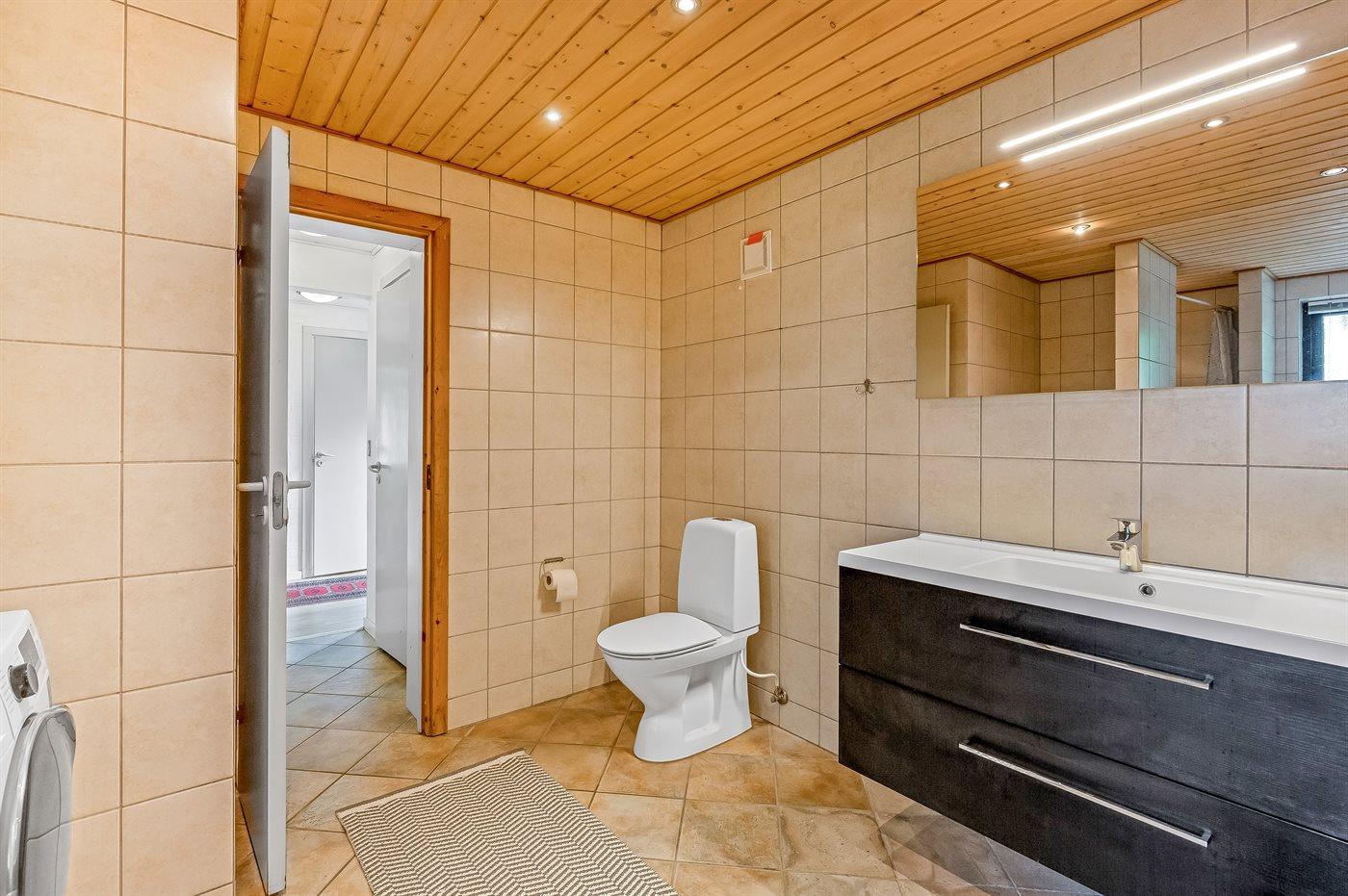 Der er 1 badeværelse med bruseniche og 2 toiletter, heraf 1 gæstetoilet. Der er gulvvarme på 1 badeværelse. I saunaen er der mulighed for afslapning.