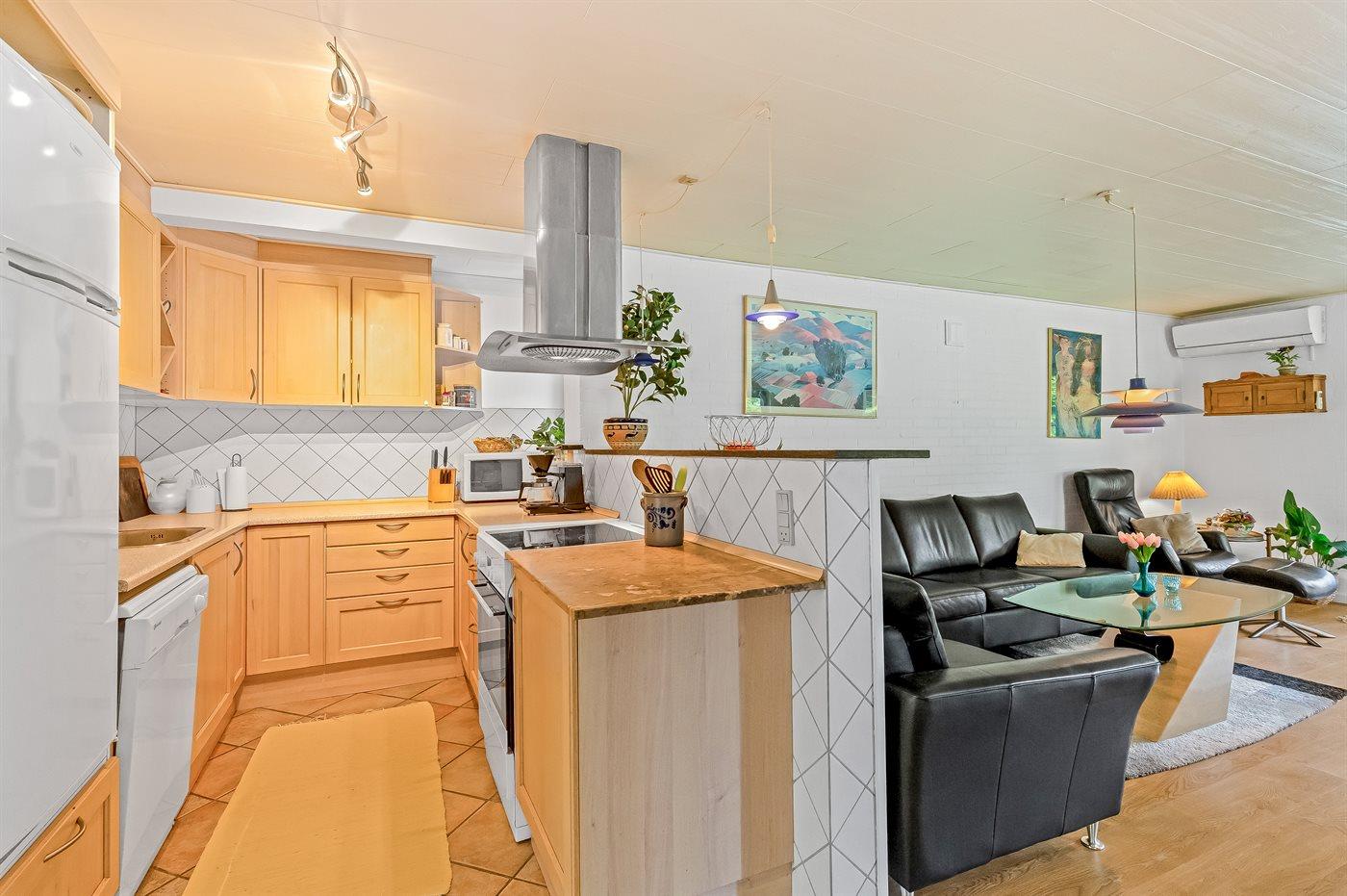 Køkkenet er udstyret med 1 køleskab. Der er 4 keramiske kogeplader, varmluftovn, mikrobølgeovn samt opvaskemaskine.