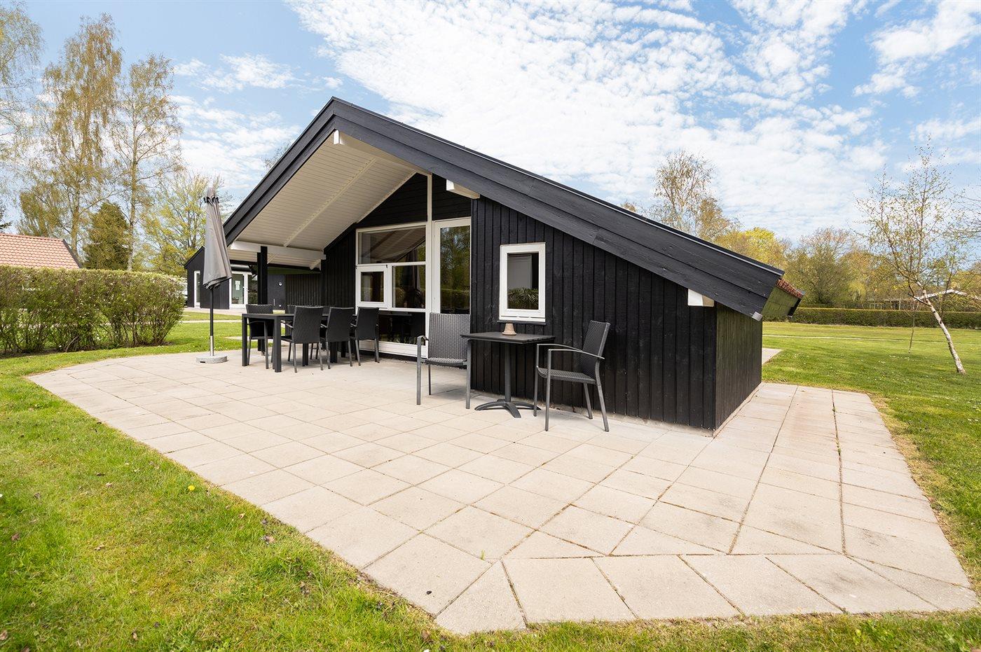 Hyggeligt sommerhus i Marielyst med egen terrasse nær børnevenlig strand og fælles legeplads.