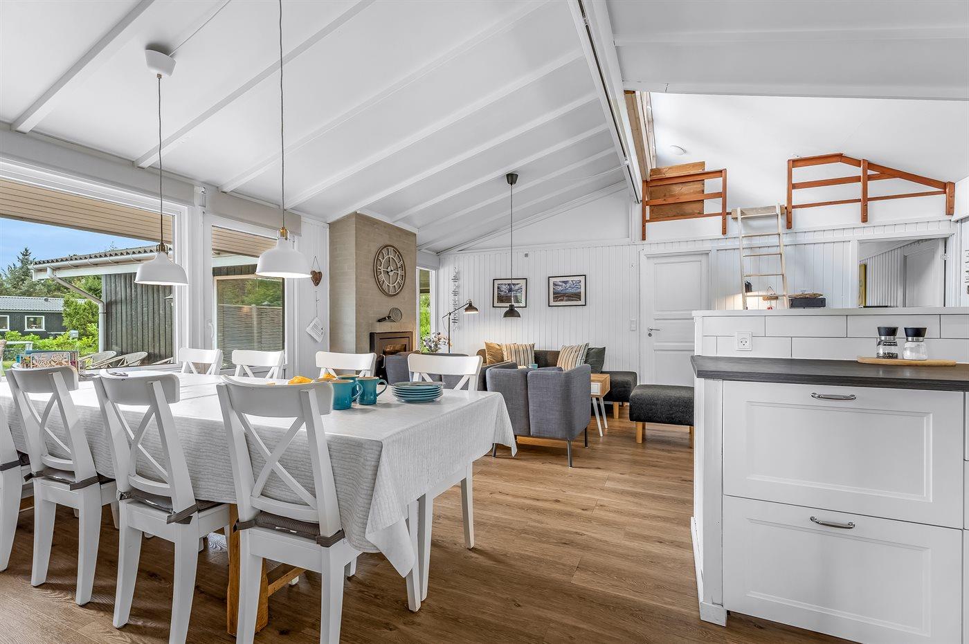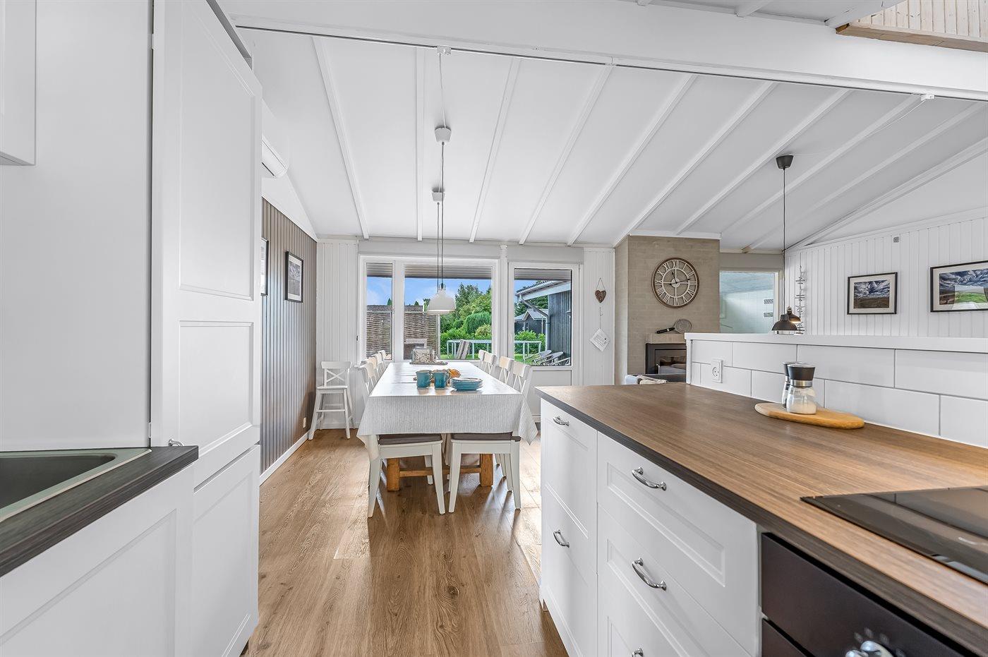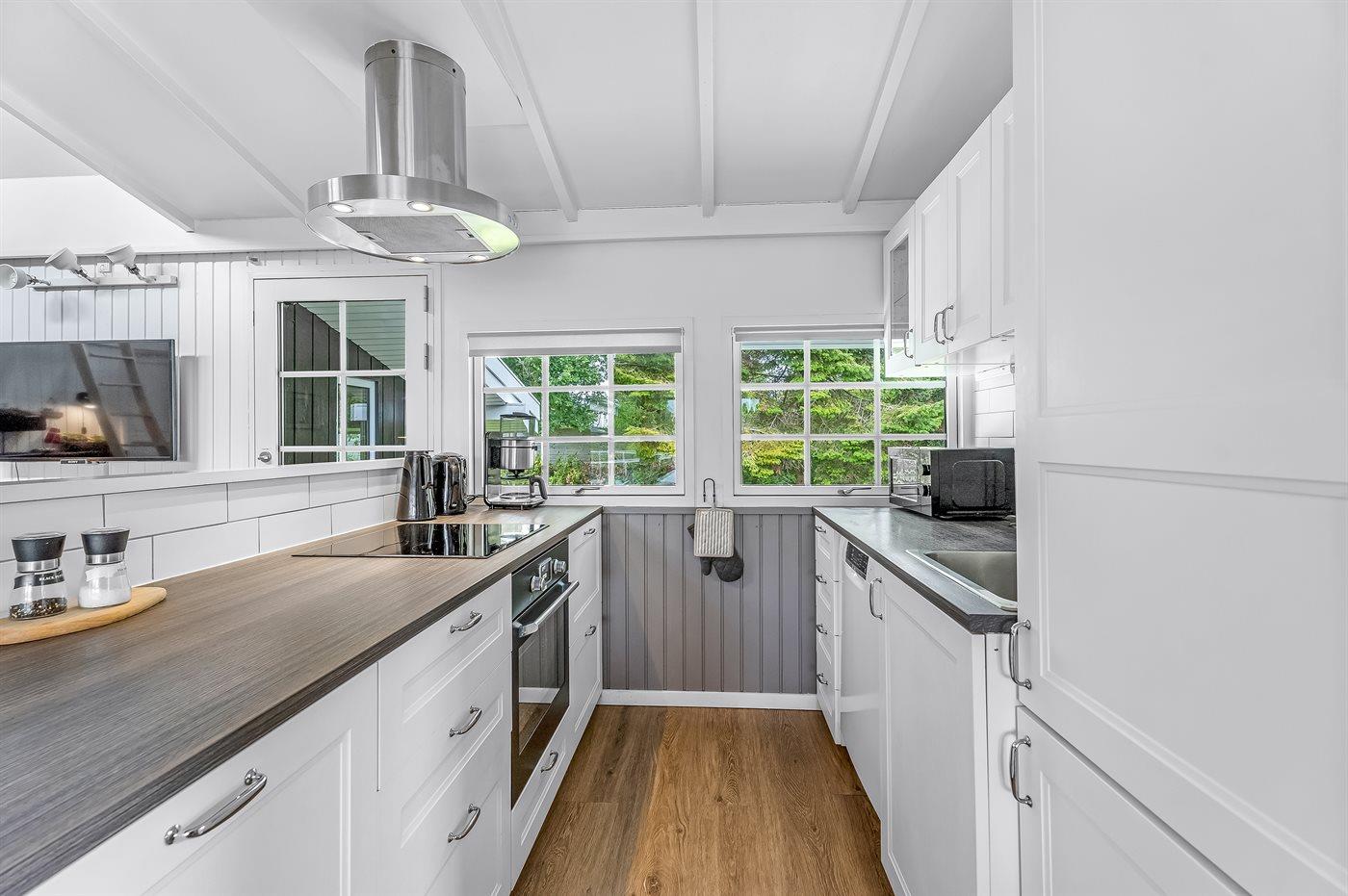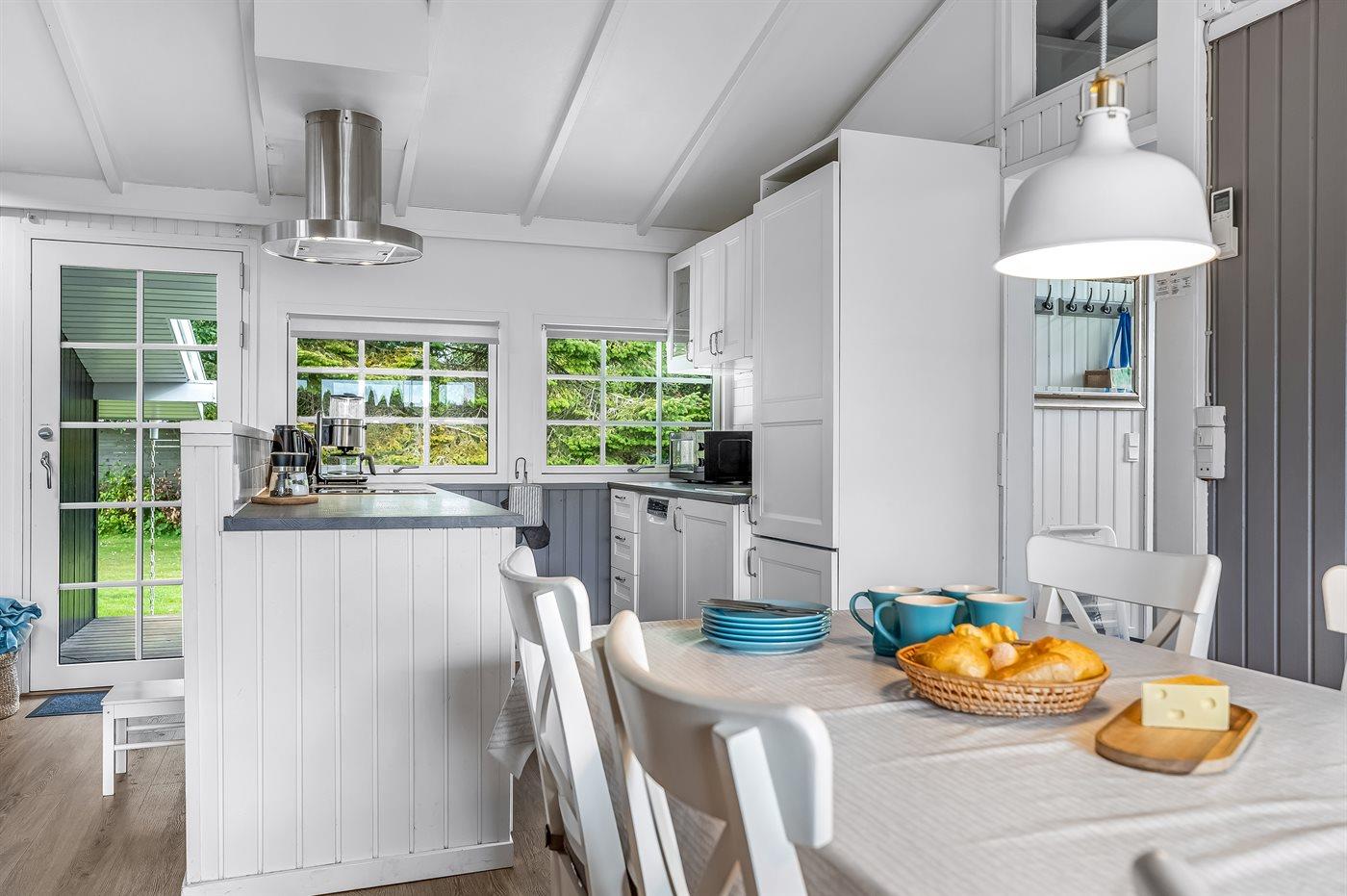 Det åbne køkken er veludstyret med bl.a. køle/frys, komfur med keramiske kogeplader og varmluftovn, emhætte, mikrobølgeovn, opvaskemaskine, kaffemaskine, elkoger m.v.