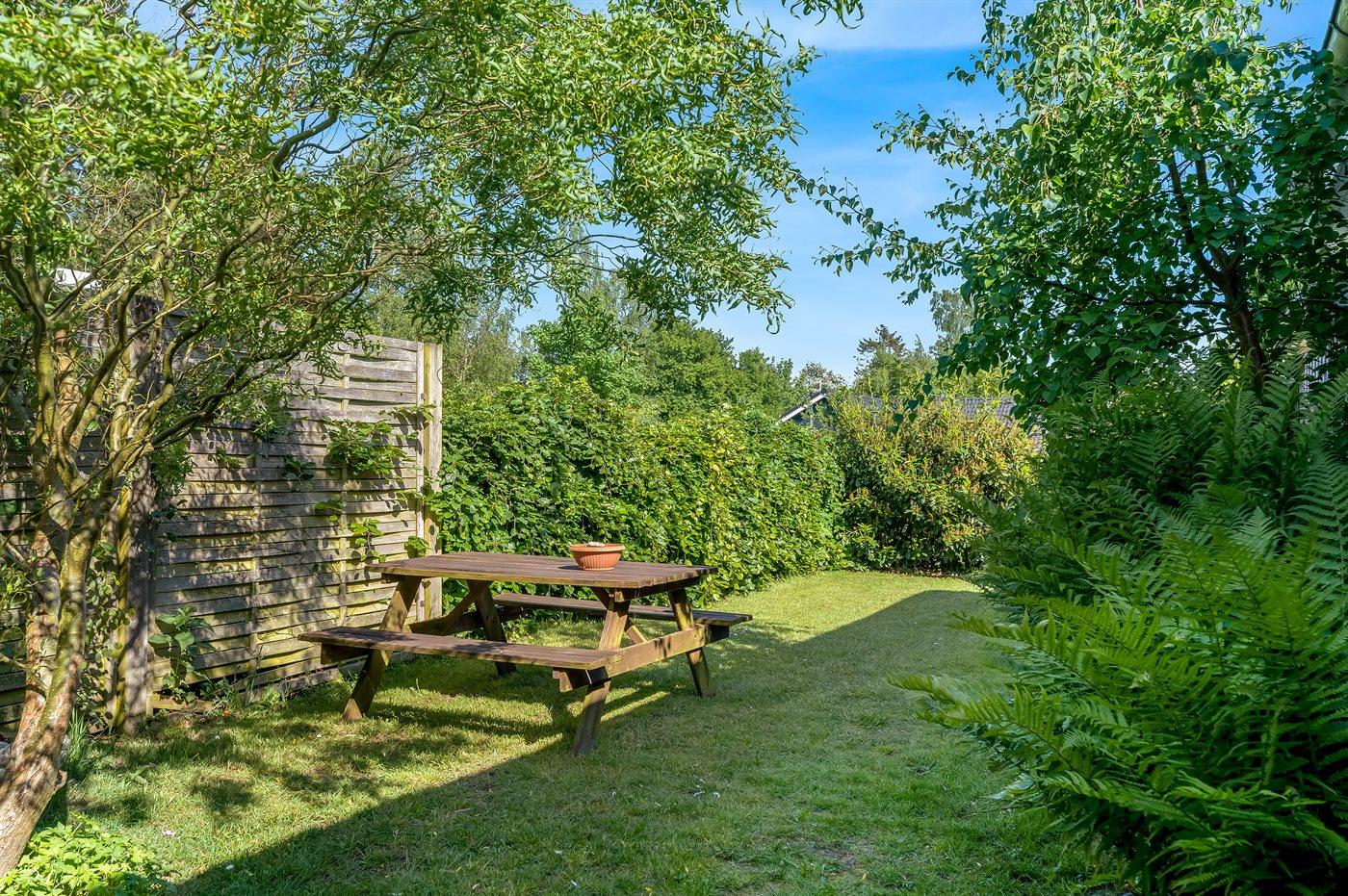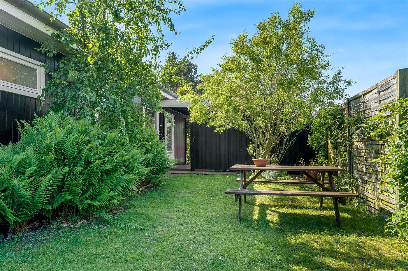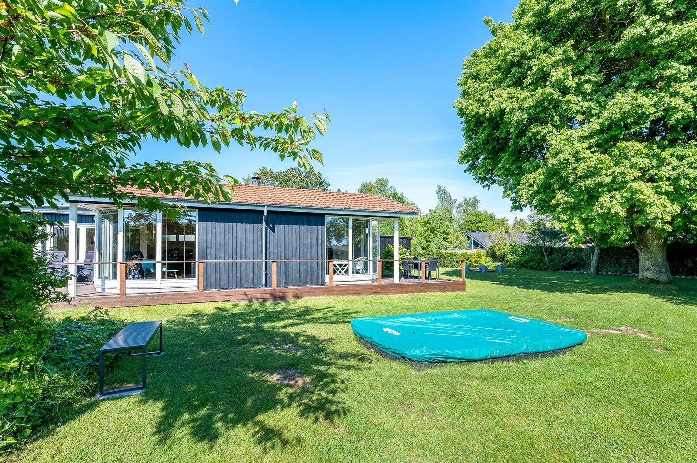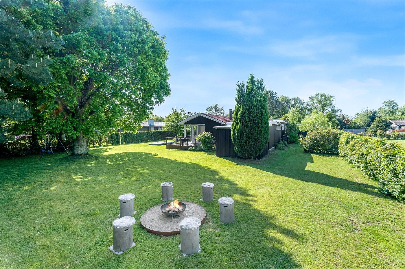 Ferieboligen er beliggende på en 1111 m² stor havegrund. Der er 700 m til havet. Nærmeste forretning er beliggende i en afstand af 400 m. Til ferieboligen hører 30 m² terrasseareal. Desuden er der 22 m² overdækket terrasse. Ligeledes er der adgang til udestue. Der er redskabsrum. Gynge. Sandkasse. Trampolin (maks. vægtbelastning 100 kg). Der er carport til rådighed. Parkering ved ferieboligen.