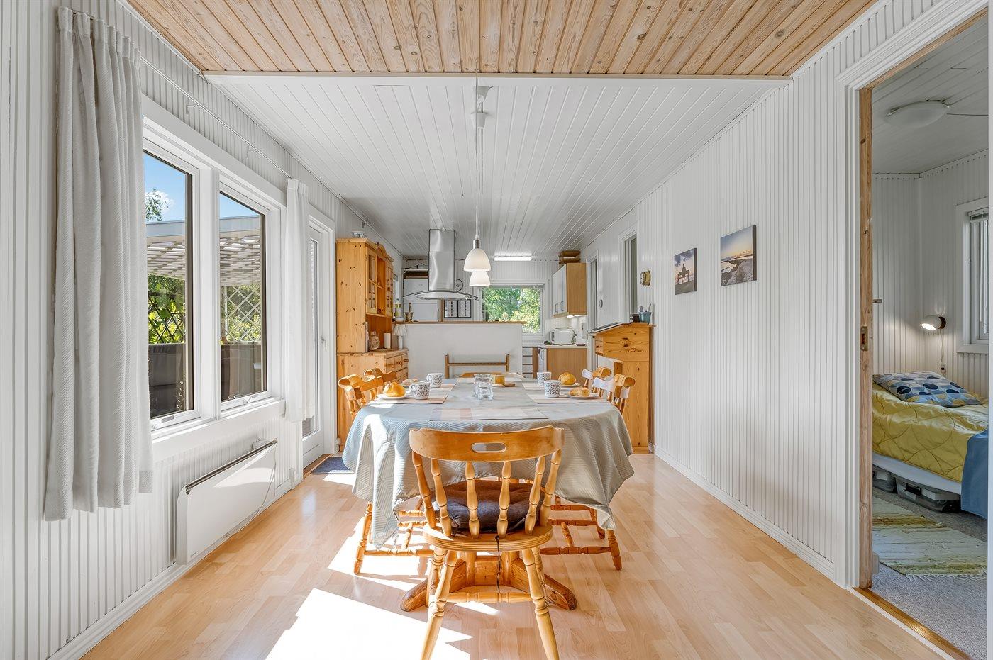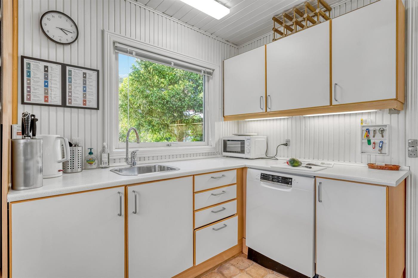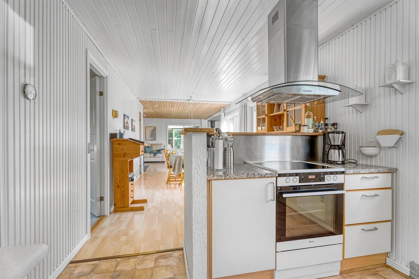 Køkkenet er udstyret med 1 køleskab. Der er 4 induktionskogeplader, varmluftovn, mikrobølgeovn samt opvaskemaskine.