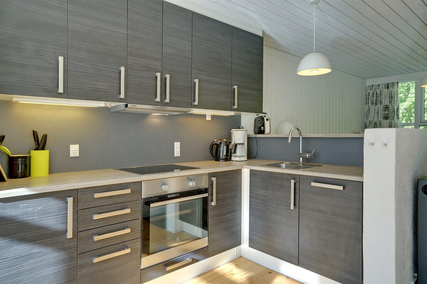 Køkkenet er udstyret med 1 køleskab. Der er 4 keramiske kogeplader, varmluftovn, mikrobølgeovn samt opvaskemaskine.