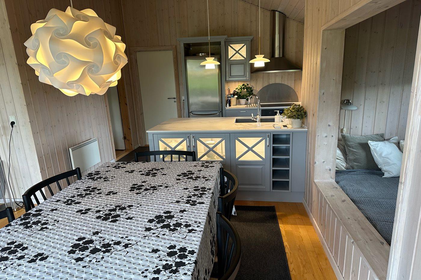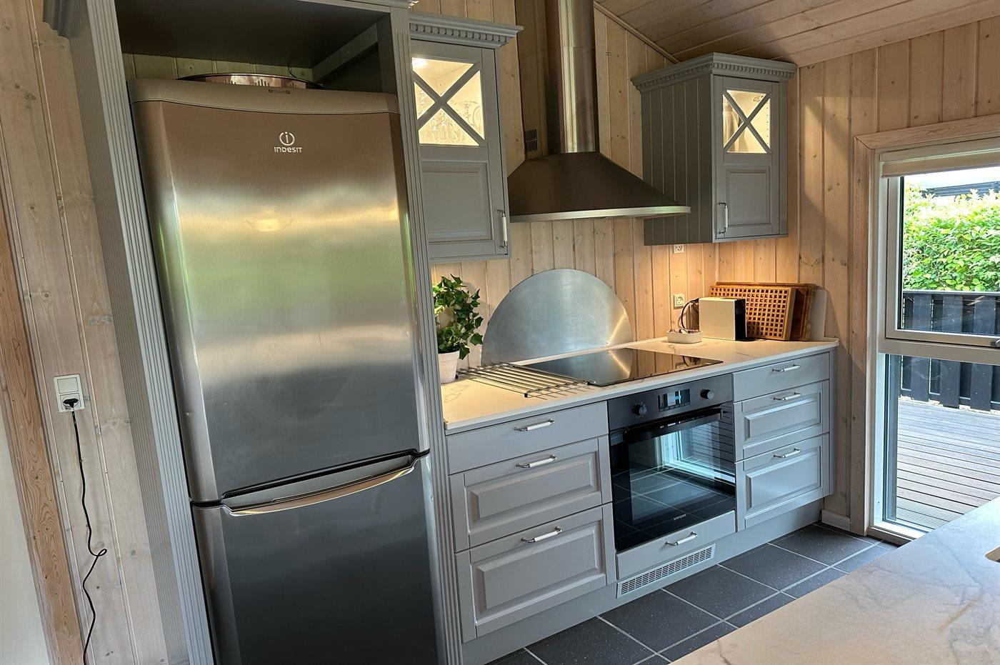 Køkkenet er udstyret med 1 køleskab. Der er 4 induktionskogeplader, varmluftovn, mikrobølgeovn samt opvaskemaskine.