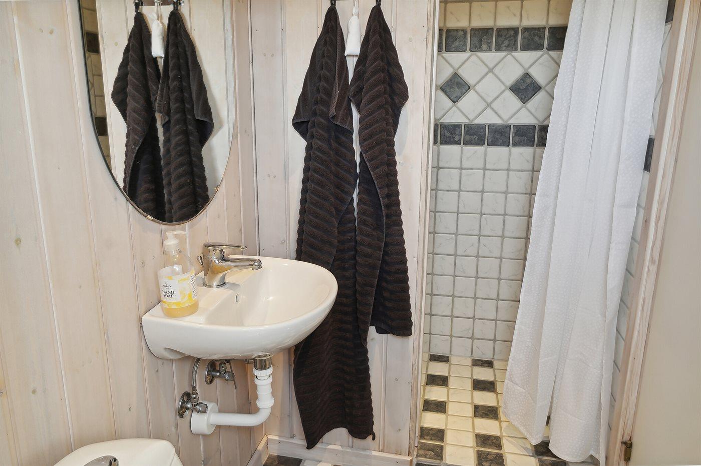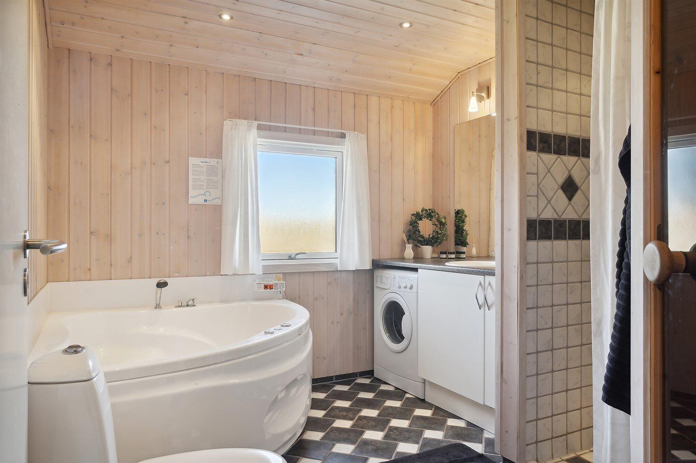 Der er 2 badeværelser med bruseniche og 2 toiletter. Der er gulvvarme på 2 badeværelser. I saunaen er der mulighed for afslapning.