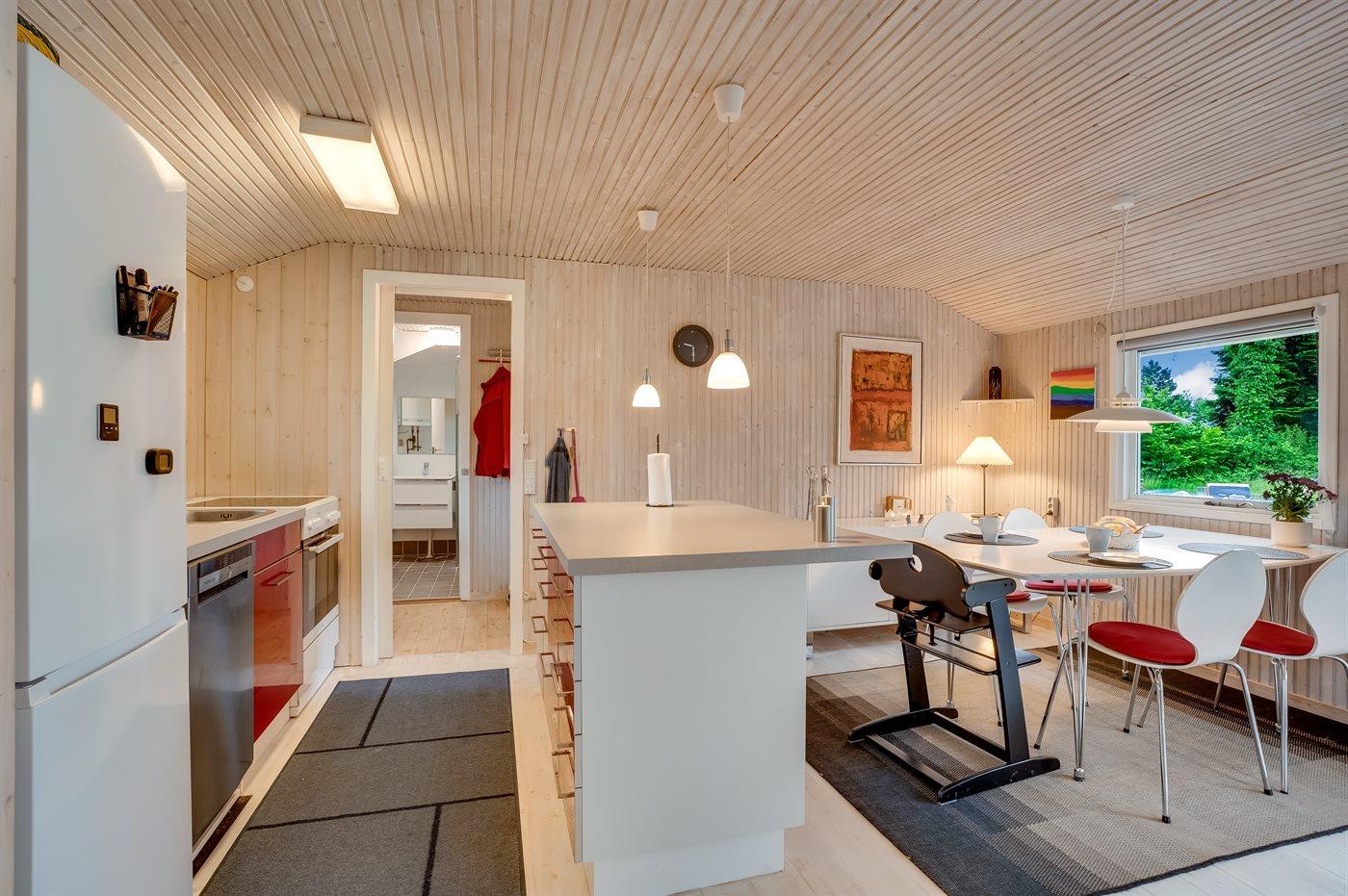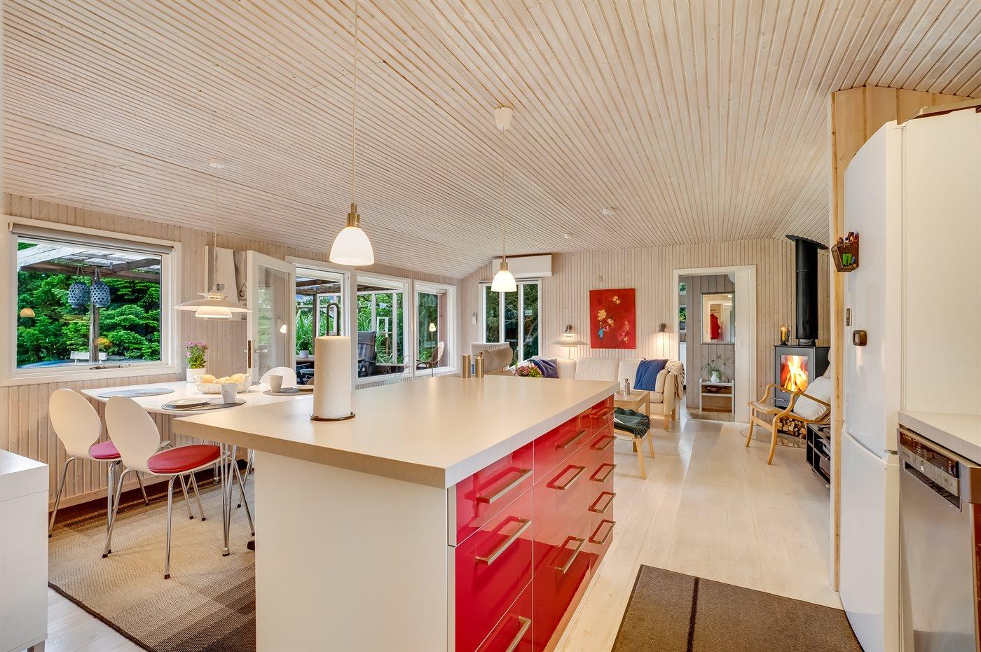 Køkkenet er udstyret med 1 køleskab. Der er 4 keramiske kogeplader, varmluftovn samt opvaskemaskine.