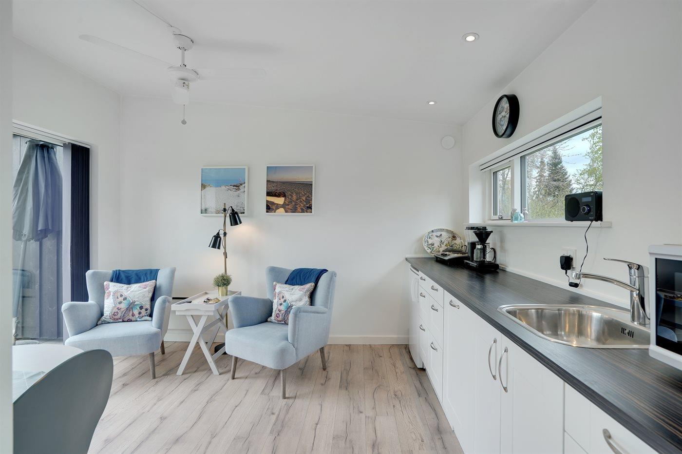 Køkkenet er udstyret med 1 køleskab. Der er 2 elkogeplader, miniovn, mikrobølgeovn samt opvaskemaskine.