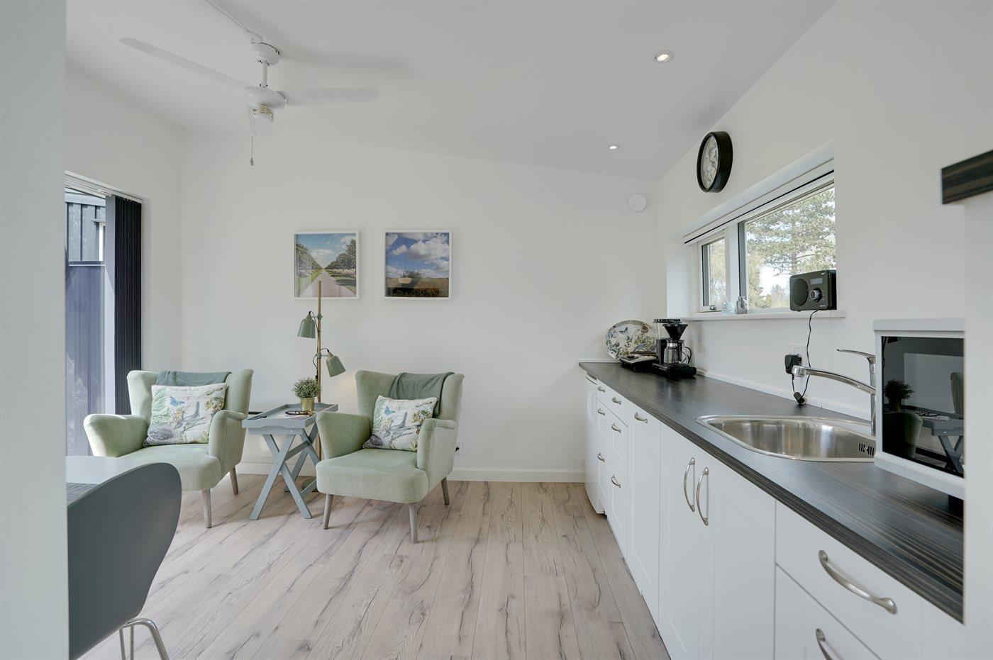 Køkkenet er udstyret med 1 køleskab. Der er 2 elkogeplader, miniovn, mikrobølgeovn samt opvaskemaskine.