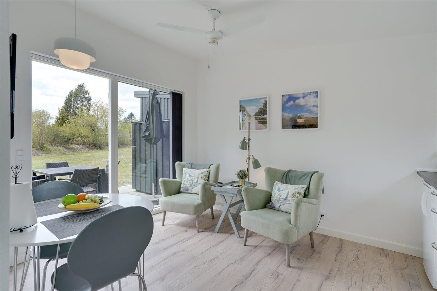 På en 6350 m² stor fælles havegrund med i alt 4 sommerhuse og 3 ferielejligheder ligger denne nybyggede, mindre ferielejlighed i et attraktivt og naturskønt område tæt på børnevenlig badestrand. Bemærk: Sovepladserne befinder sig i alkove i opholdsstuen (se grundplan).