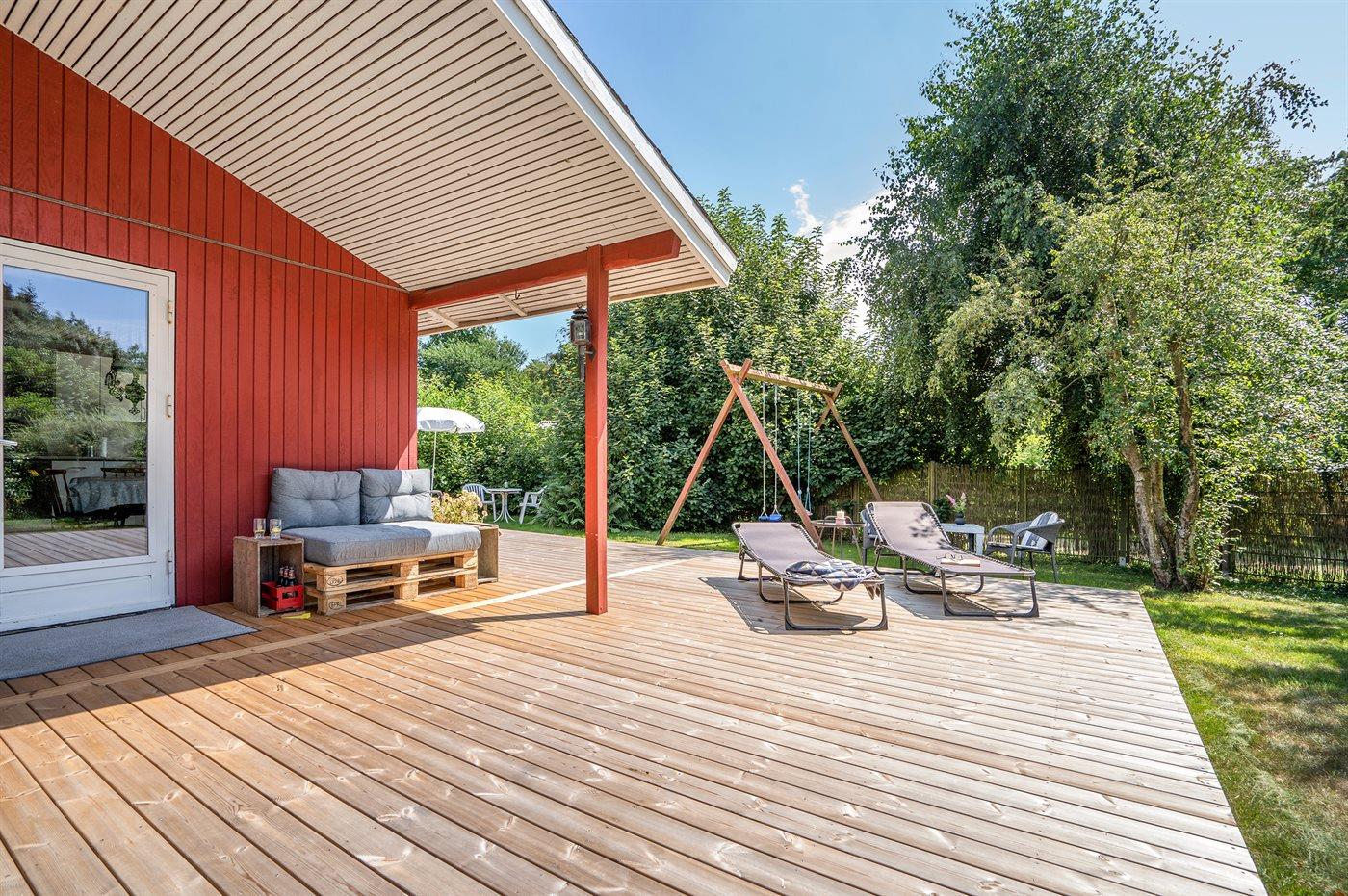 Hyggeligt sommerhus nær børnevenlig strand med stor have, terrasse og elbil-oplader.