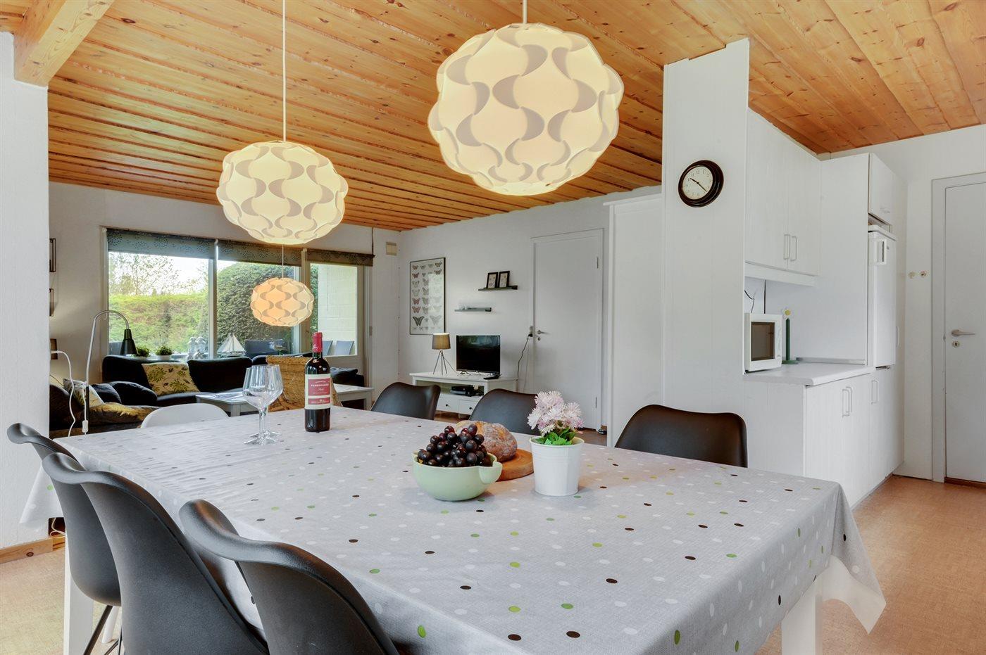 Køkkenet er udstyret med 1 køleskab. Der er 4 elkogeplader, varmluftovn, mikrobølgeovn samt opvaskemaskine.