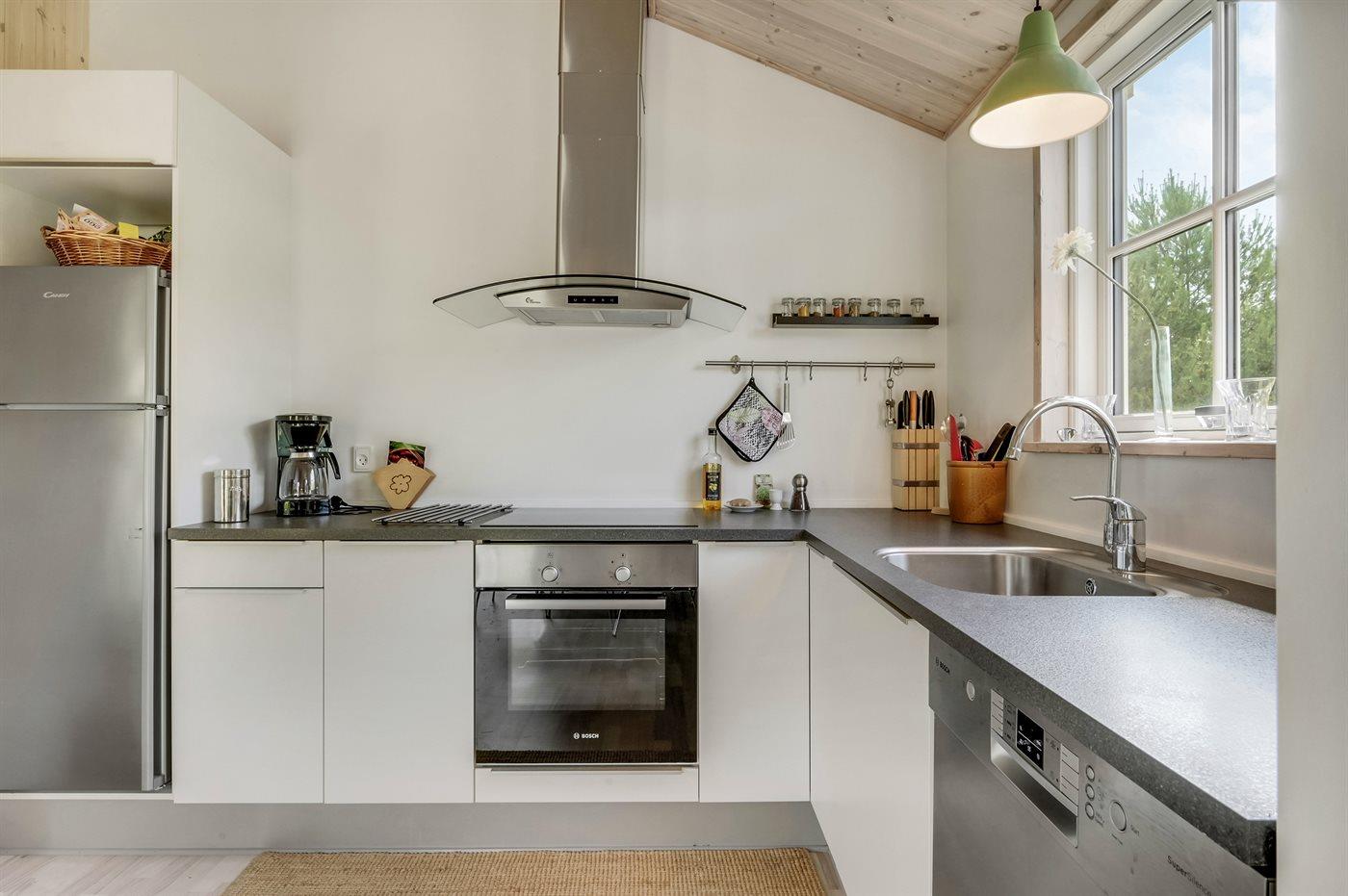 Køkkenet er udstyret med 1 køleskab. Der er 4 keramiske kogeplader, varmluftovn samt opvaskemaskine.