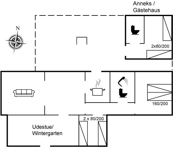 Der er i alt 2 soveværelser. Sovepladserne fordeler sig på: 2 sovepladser i dobbeltseng. 4 sovepladser i enkeltsenge. 2 af disse sovepladser befinder sig i anneks. Derudover er der 1 stk. barneseng.