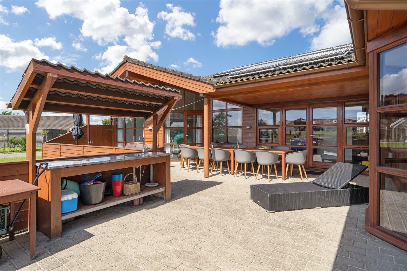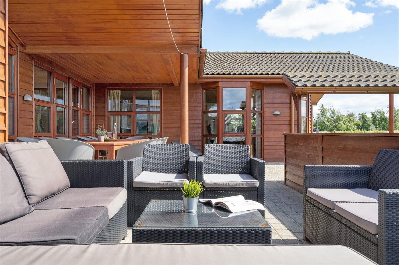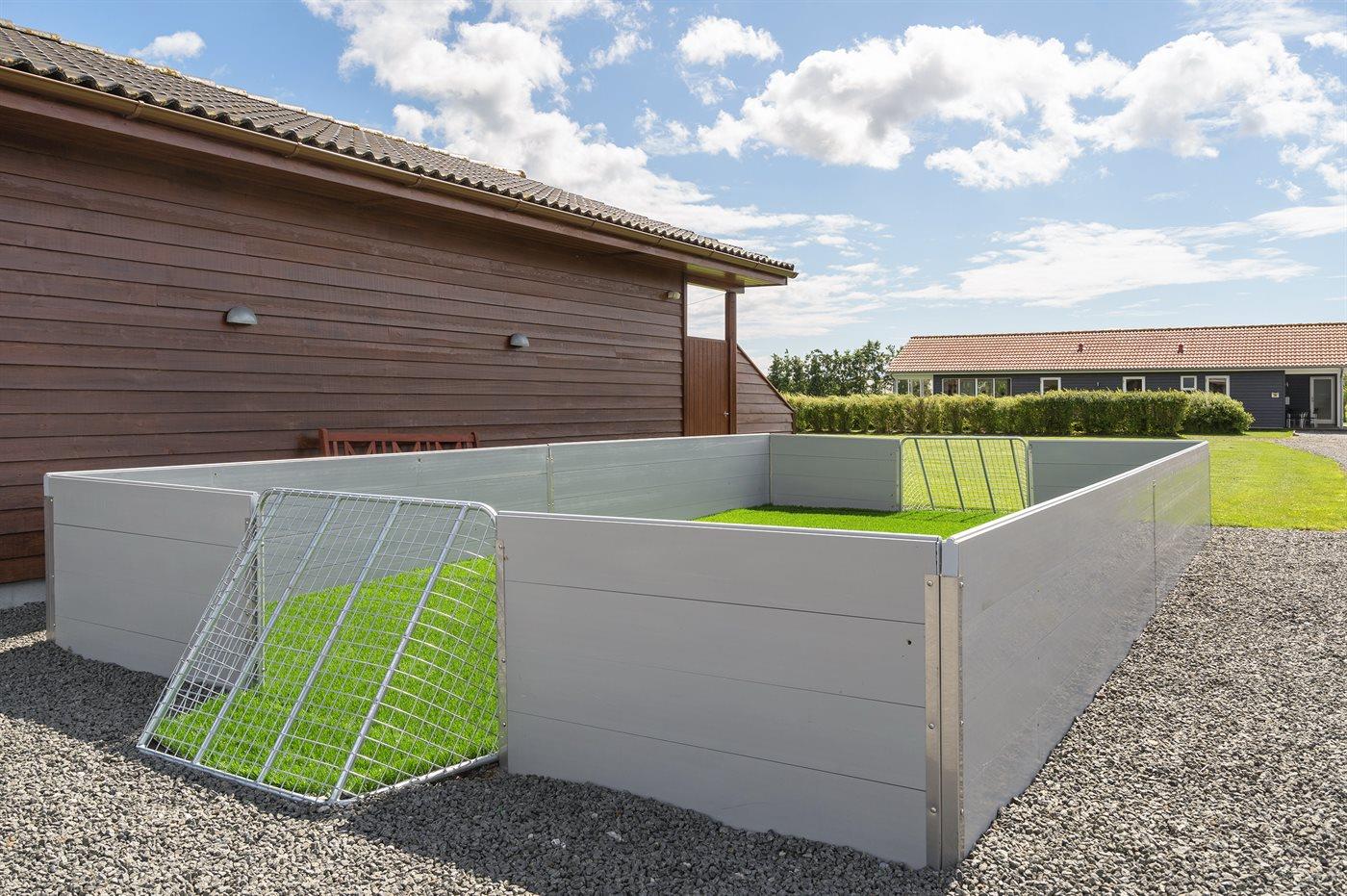 Ferieboligen er beliggende på en 1690 m² stor havegrund. Der er 800 m til havet. Nærmeste forretning er beliggende i en afstand af 400 m. Der er en golfbane i en afstand af 3000 m. Til ferieboligen hører åben terrasse samt 30 m² overdækket terrasse. Sandkasse. Fodboldmål. Der er mulighed for at tilberede maden udendørs i udekøkkenet. Grill til rådighed. Parkering ved ferieboligen.