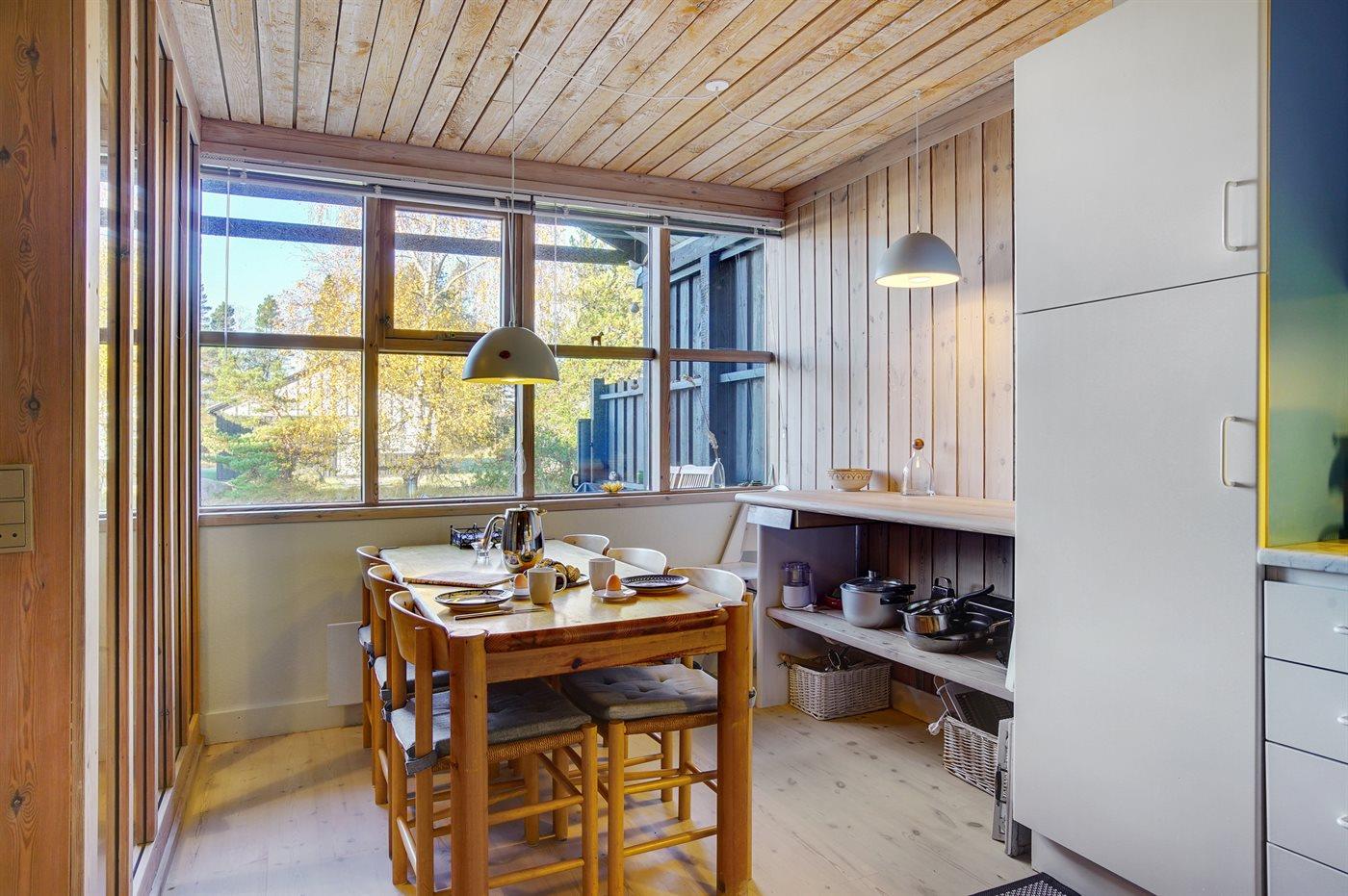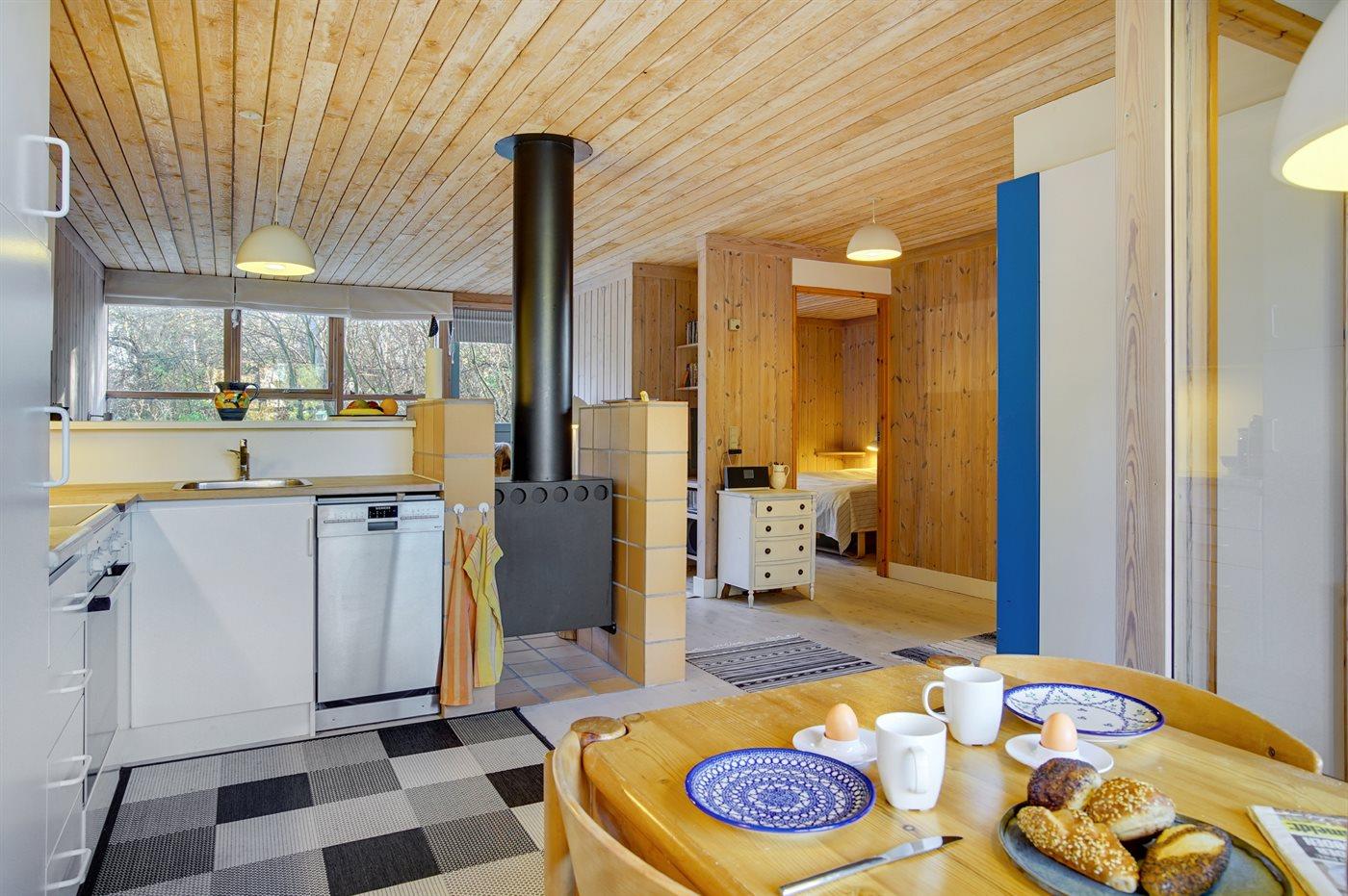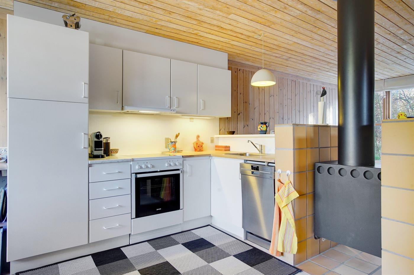Køkkenet er udstyret med 1 køleskab. Der er 4 keramiske kogeplader, varmluftovn, mikrobølgeovn samt opvaskemaskine.