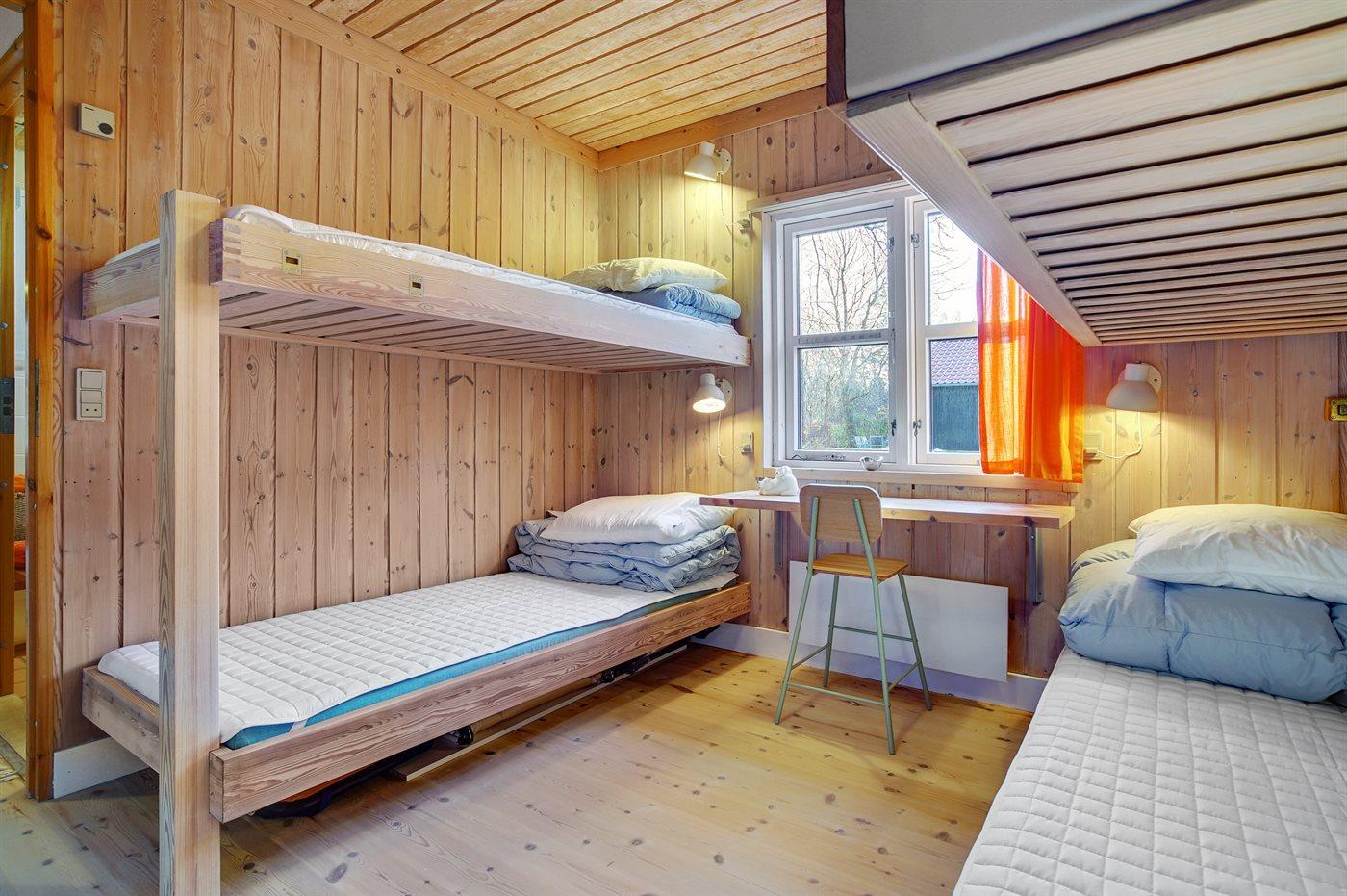 Der er i alt 2 soveværelser. Sovepladserne fordeler sig på: 2 sovepladser i dobbeltseng. 4 sovepladser i køjesenge. Derudover er der 1 stk. barneseng.