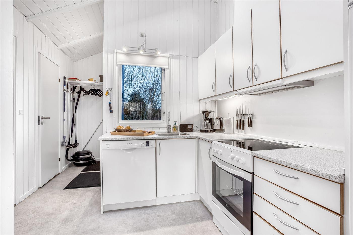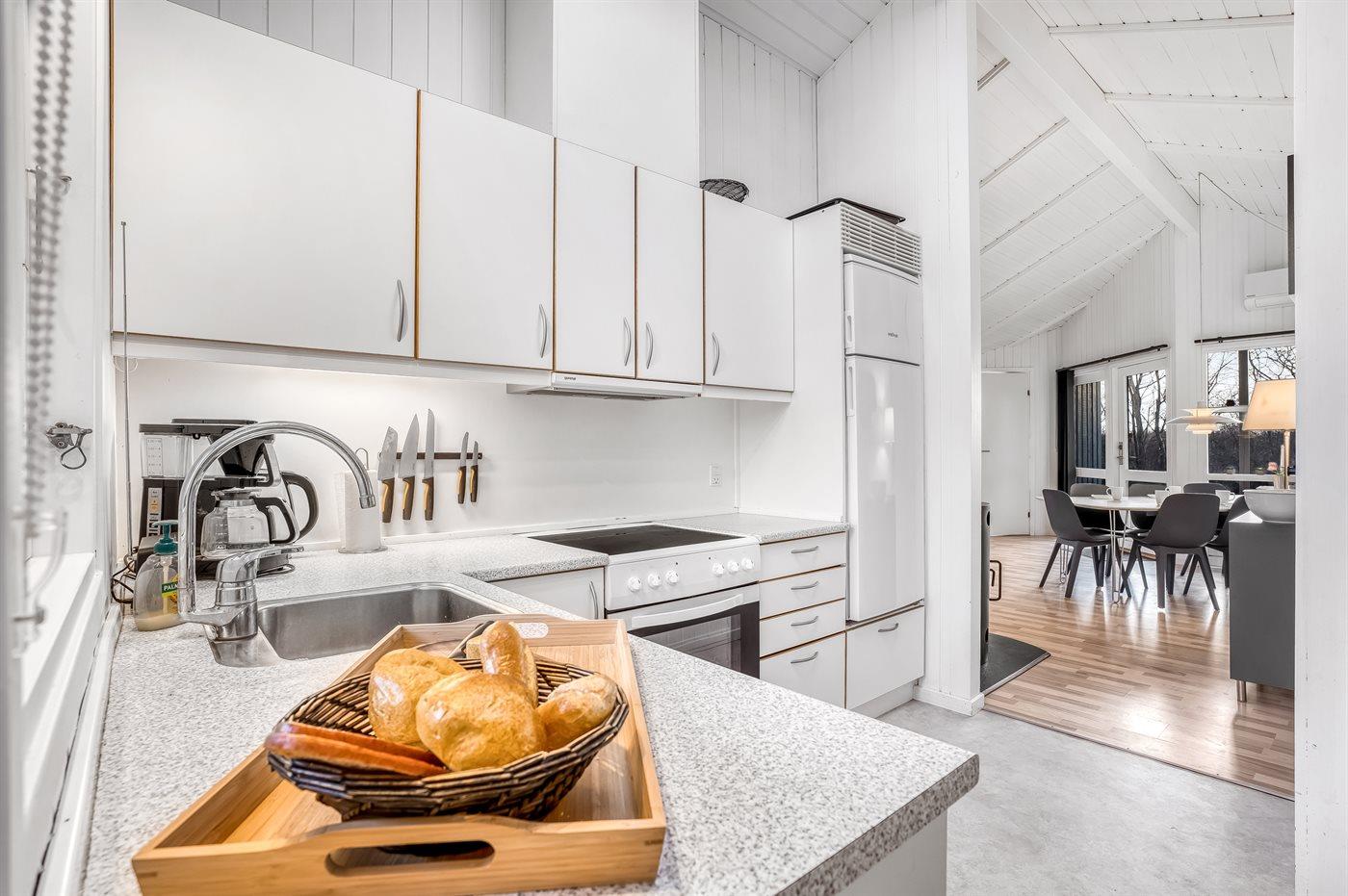 Køkkenet er udstyret med 1 køleskab. Der er 4 elkogeplader, varmluftovn, mikrobølgeovn samt opvaskemaskine.