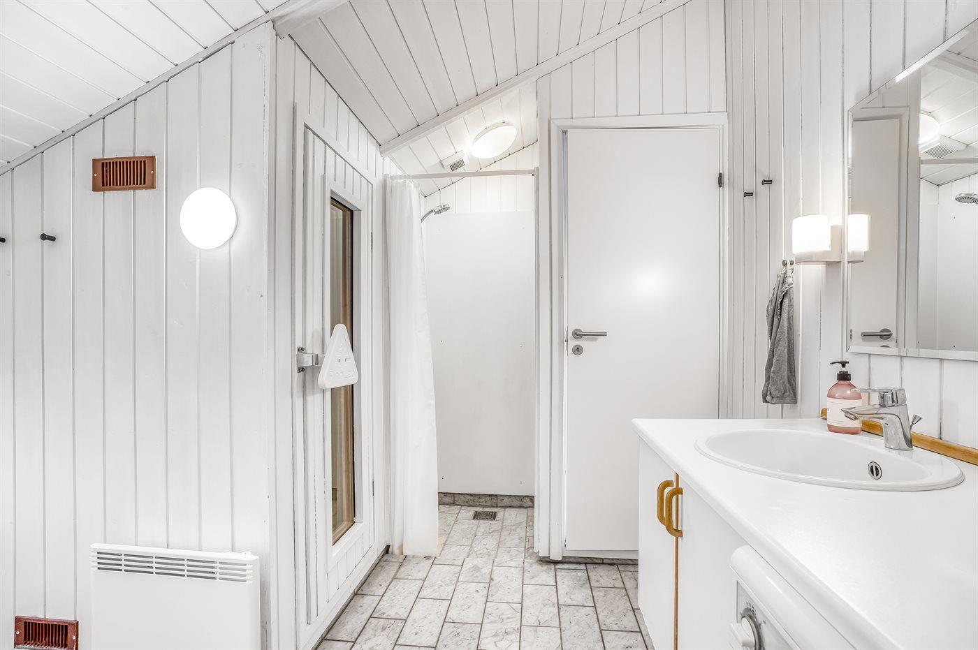Der er 1 badeværelse med bruseniche og 2 toiletter, heraf 1 gæstetoilet. Der er gulvvarme på 1 badeværelse.. Badekar. I saunaen er der mulighed for afslapning.