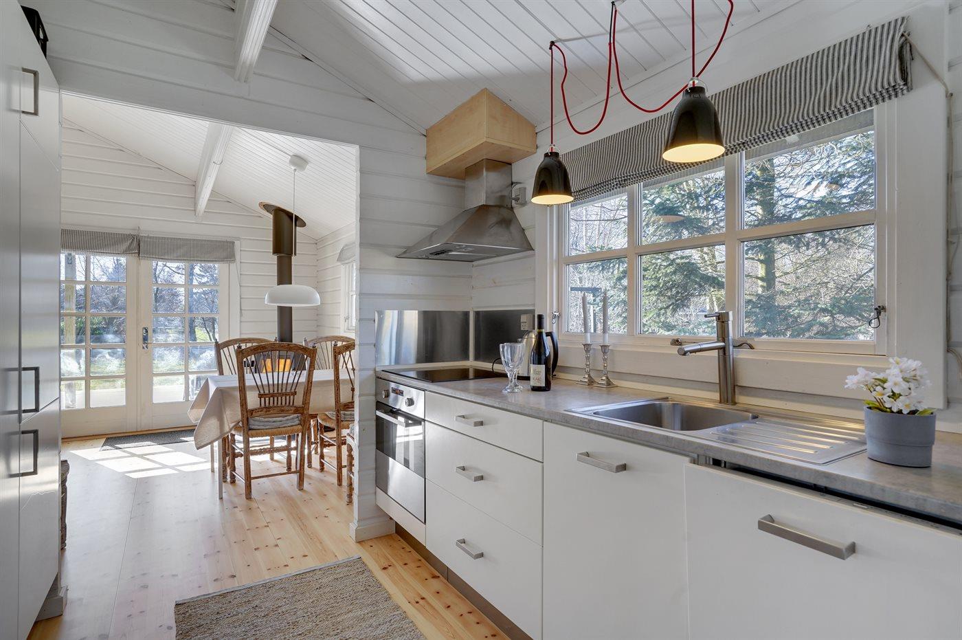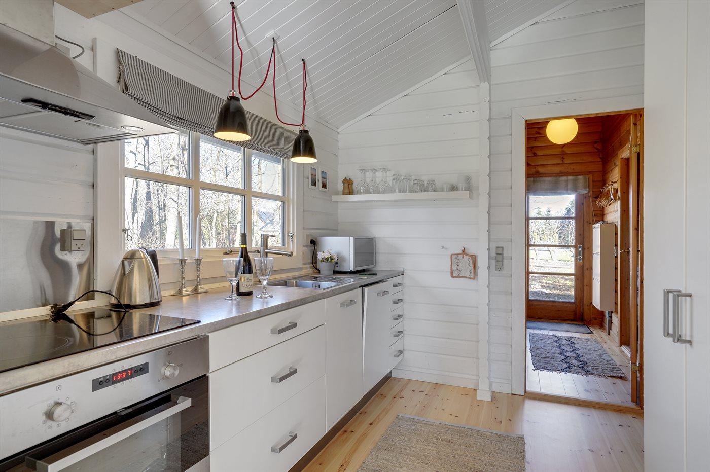 Køkkenet er udstyret med 1 køleskab. Der er 4 keramiske kogeplader, varmluftovn, mikrobølgeovn samt opvaskemaskine.