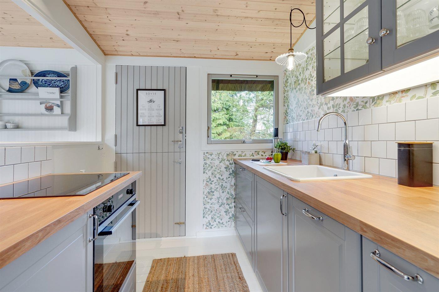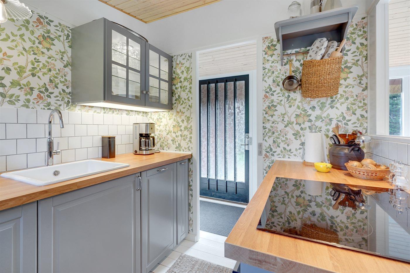 Køkkenet er udstyret med 1 køleskab. Der er 4 induktionskogeplader, varmluftovn samt opvaskemaskine.