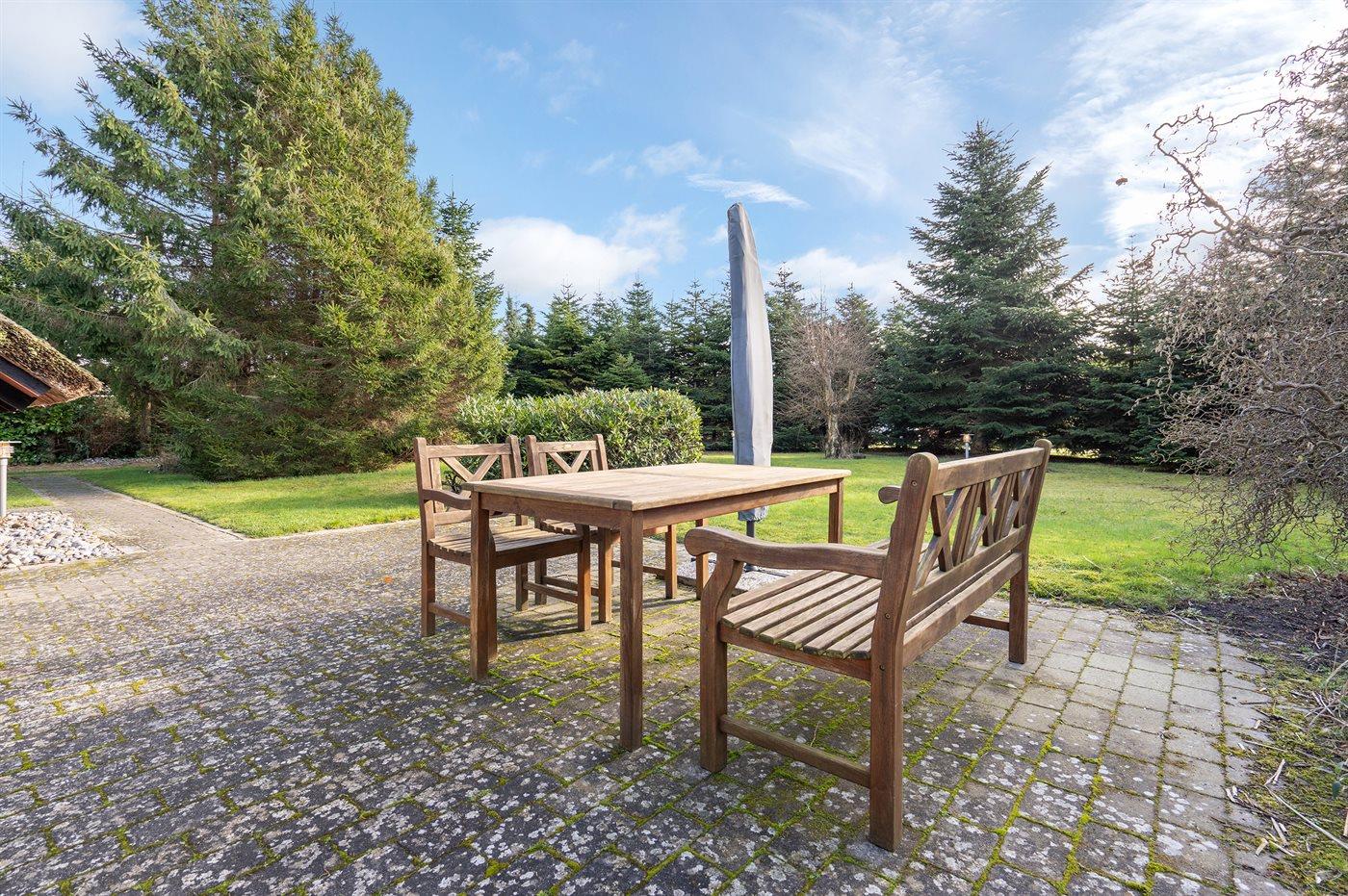 Ferieboligen er beliggende på en 1400 m² stor havegrund. Der er 870 m til havet. Nærmeste forretning er beliggende i en afstand af 900 m. Der er en golfbane i en afstand af 750 m. Til ferieboligen hører åbent terrasseareal. Gynge. Sandkasse. Rutchebane. Der ligger en legeplads i en afstand af 800 m. Der er carport til rådighed. Der er installeret stik til opladning af elbil. Type 2 stik. Med 11 kW ladeeffekt. Parkering ved ferieboligen.