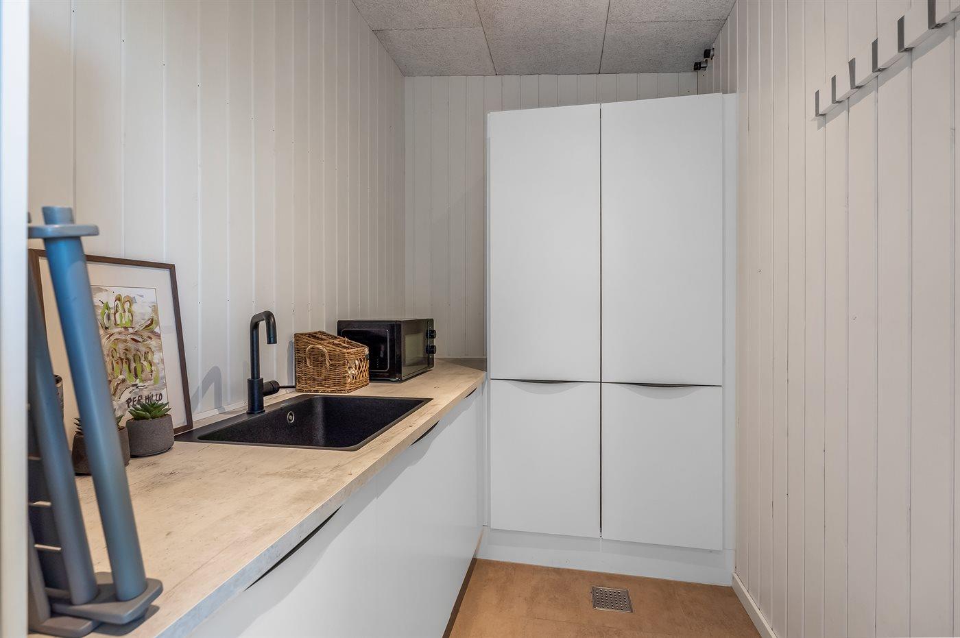 Der er to flotte badeværelser med bruseniche og toilet, og fra det ene er der direkte adgang til saunaen – ideelt efter en lang gåtur eller en tur i den udendørs spa. Bryggerset er udstyret med både vaskemaskine og tørretumbler. Desuden findes der strygejern og strygebræt. Til de mindste gæster findes der en weekendseng, højstol og puslepude.