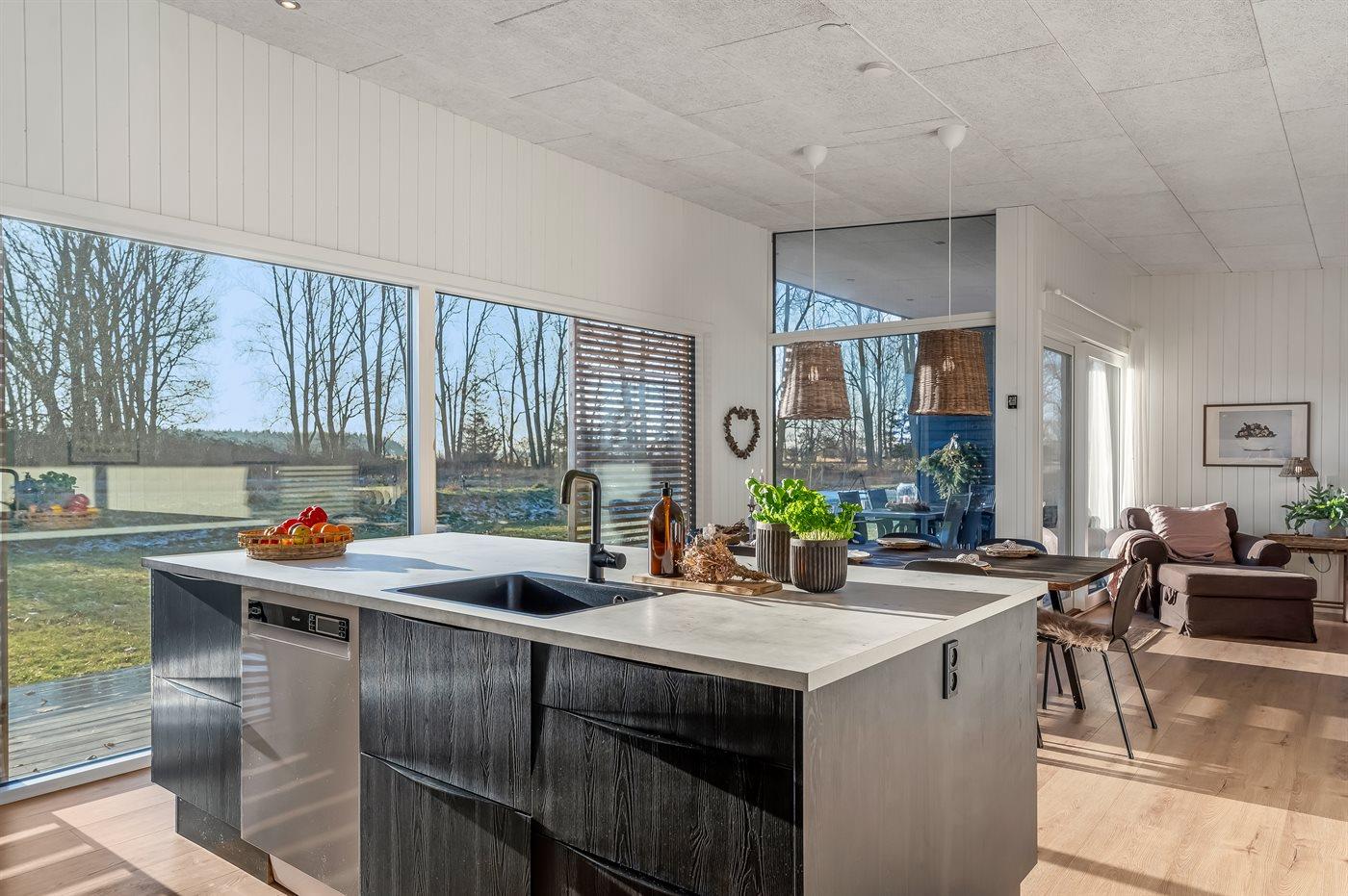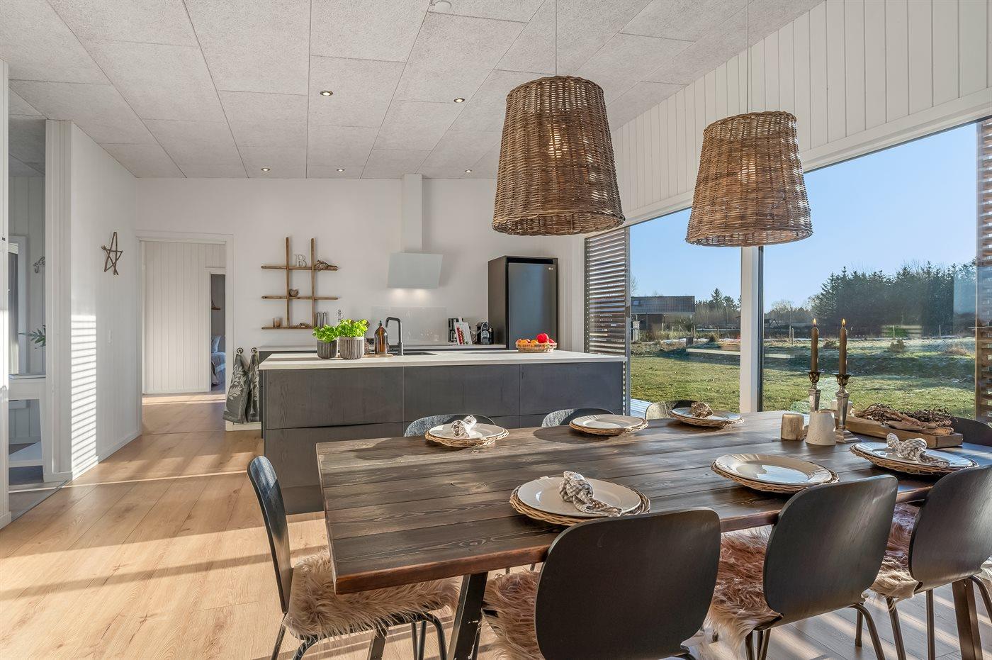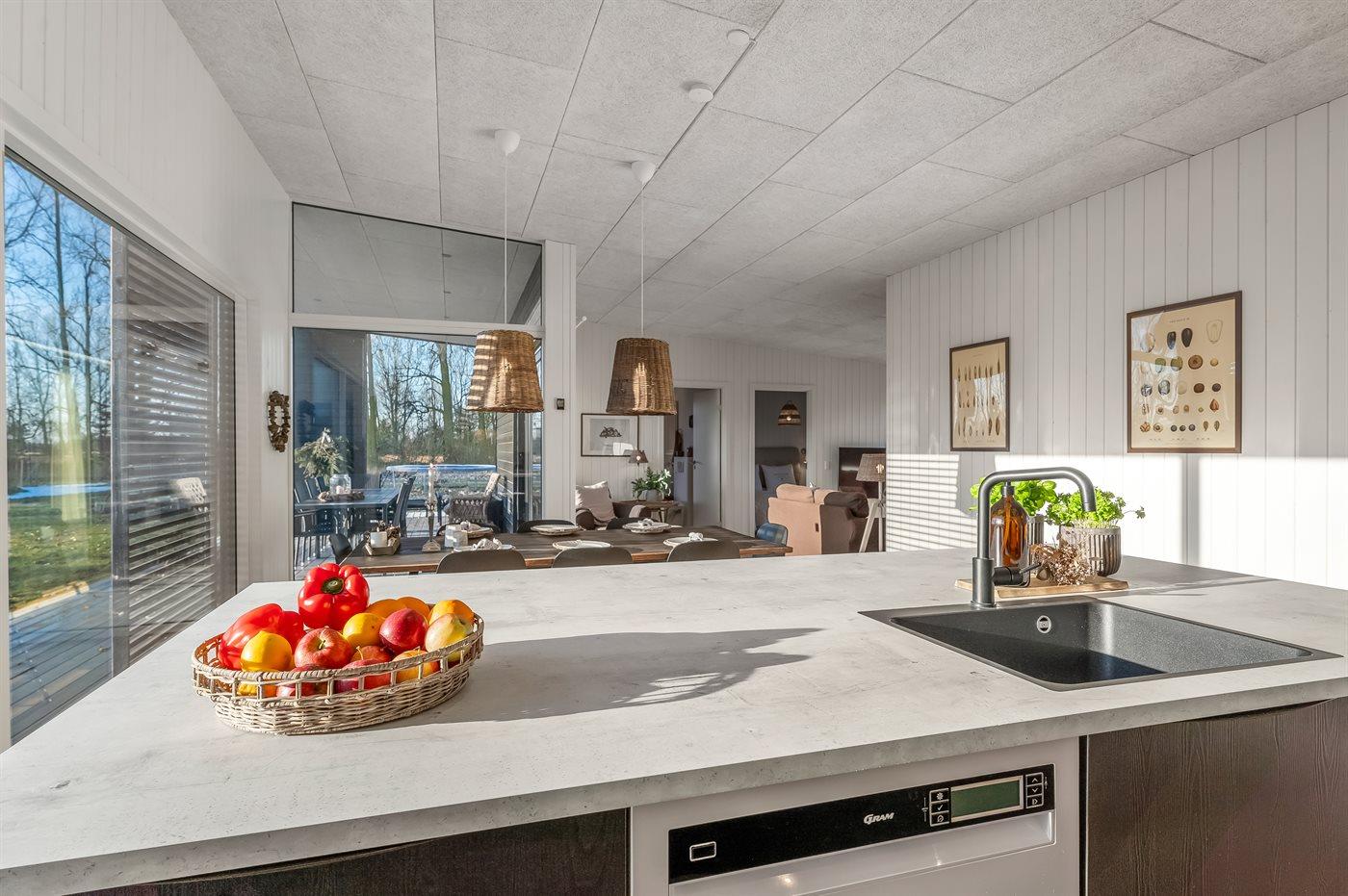 Køkkenet er lyst, moderne og særdeles veludstyret, så der er god mulighed for at tilberede lækre feriemåltider. Her finder I blandt andet køleskab med fryser, induktionskomfur, varmluftsovn, opvaskemaskine, mikrobølgeovn, kaffemaskine samt Nespresso-maskine med mælkeskummer – og selvfølgelig også brødrister og håndmixer.