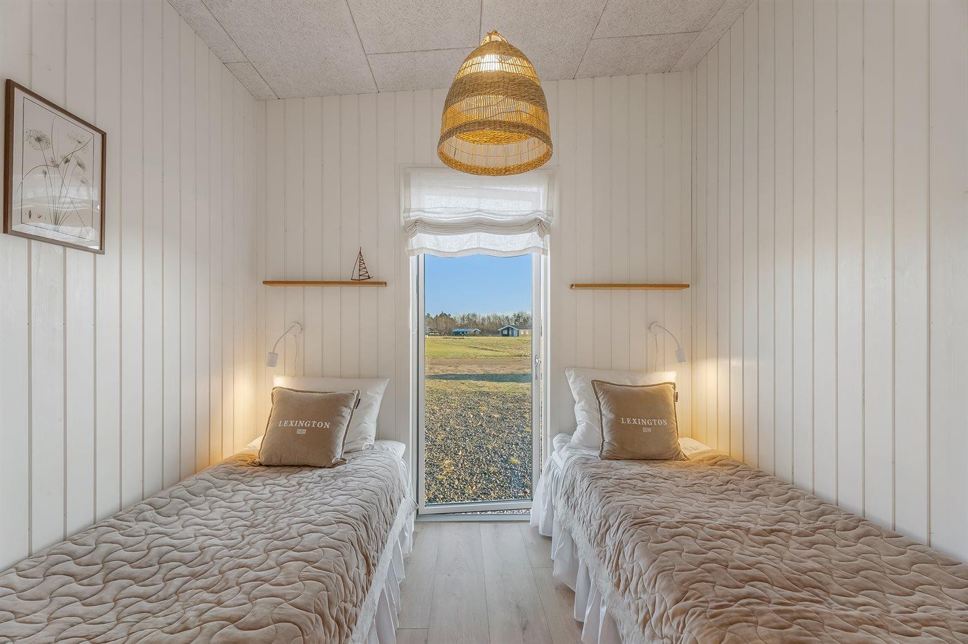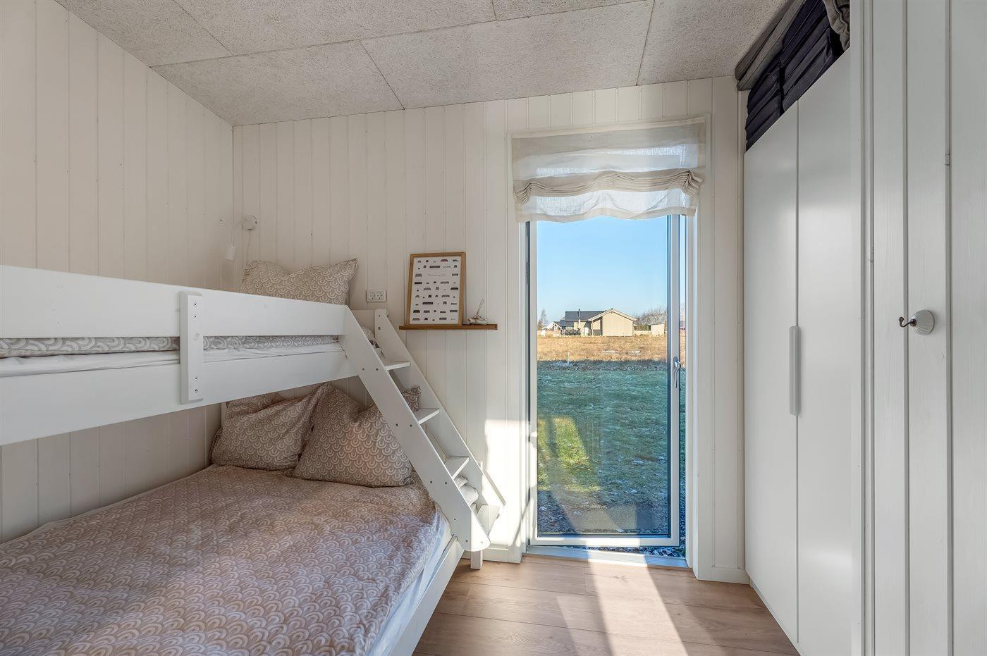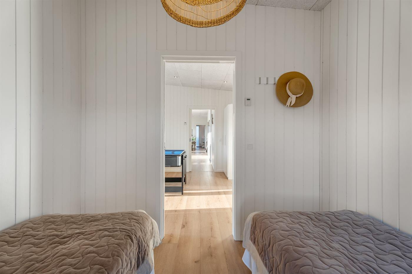 Huset rummer i alt 4 soveværelser: to værelser med dobbeltsenge (to enkeltsenge samlet), ét værelse med to enkeltsenge samt ét værelse med køjeseng med tre sovepladser – perfekt til både børn og voksne. Der er opsat mørklægningsgardiner i alle soveværelser.