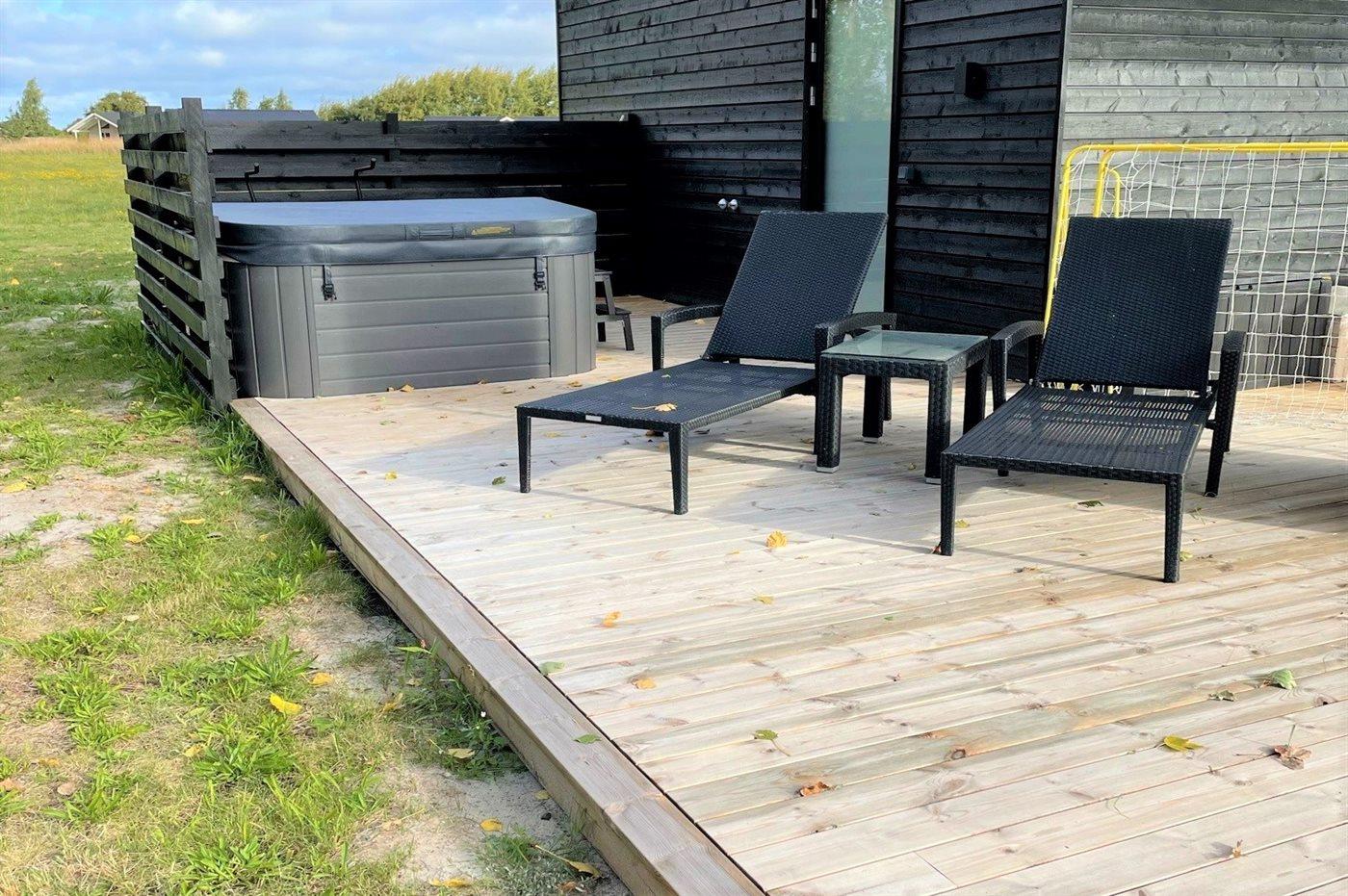 Udendørs kan I også nyde den lækre spa med plads til 5–6 personer, hvor afslapning og velvære er i fokus. Spaområdet har også en udendørsbruser (kan benyttes om sommeren) samt direkte adgang til badeværelse og sauna – en sand lille wellness-oase.